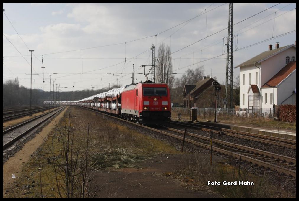 152071 passiert am 13.03.2015 um 14.29 Uhr mit einem Containerzug Richtung Münster das entwidmete und renovierte Bahnhofsgebäude in Hasbergen. Gerd Hahn