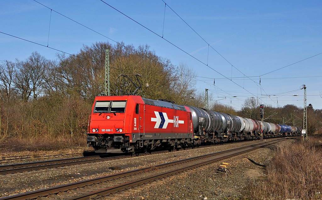 Alpha Trains Belgium 185 606, vermietet an RheinCargo (bis Aug. 2012 an HGK (2064)), zieht einen Kesselwagenzug am 08.03.15 durch den ehemaligen Bahnhof Vehrte in Richtung Osnabrück. Reinhard Kühn