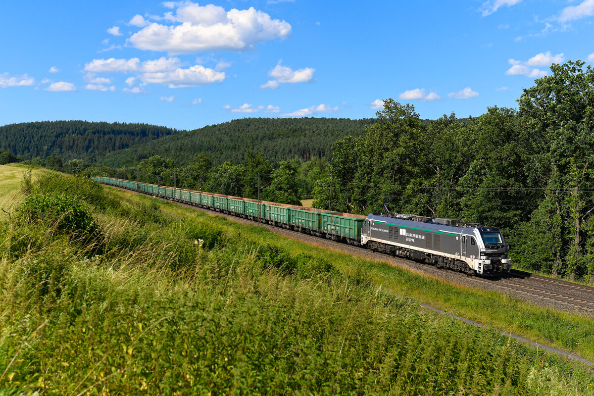 EURO DUAL Festspiele im Haunetal - Zweiter Akt: Am Abend des 28. Juni 2024 beförderte die 159 248 der Netzwerkbahn Sachsen einen leeren Holzzug von Brilon nach Aschaffenburg. Die farblich recht gefällig gestaltete Lok vor den neuen Smart GigaWood Waggons von Innofreight konnte ich bei Bernhards im osthessischen Haunetal fotografieren. Christoph Schneider