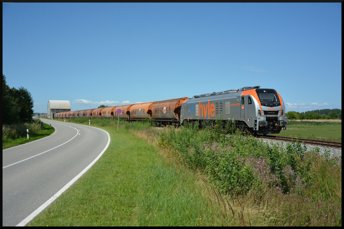 HVLE 159 005 mit einem Ganzzug WASCOSA Schüttgutwagen (Tagnpps) am 06.08.2024 im Anschluss des Hafen Vierow am Greifswalder Bodden. Mit dem Zug wurden rund 2000 Tonnen Getreide aus der Oberlausitz angeliefert. Matthias Kümmel