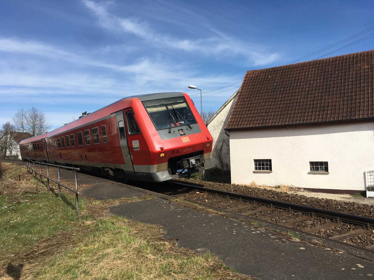 Ab dem 01.05.2018 wird die untere Höllentalbahn zwischen Neustadt (Schwarzwald) und Donaueschingen für rund 1 1/2 Jahre wegen Elektrifizierungsarbeiten gesperrt. Damit verschwindet auch die alte Signaltechnik in den Bahnhöfen Löffingen und Döggingen. Kurz vor Löffingen rauscht 611 507 am 18.03.2018 am Fotografen vorbei. Auch hier ein verspäteter Gruß zurück an den Triebwagenführer. Horst Lüdicke
