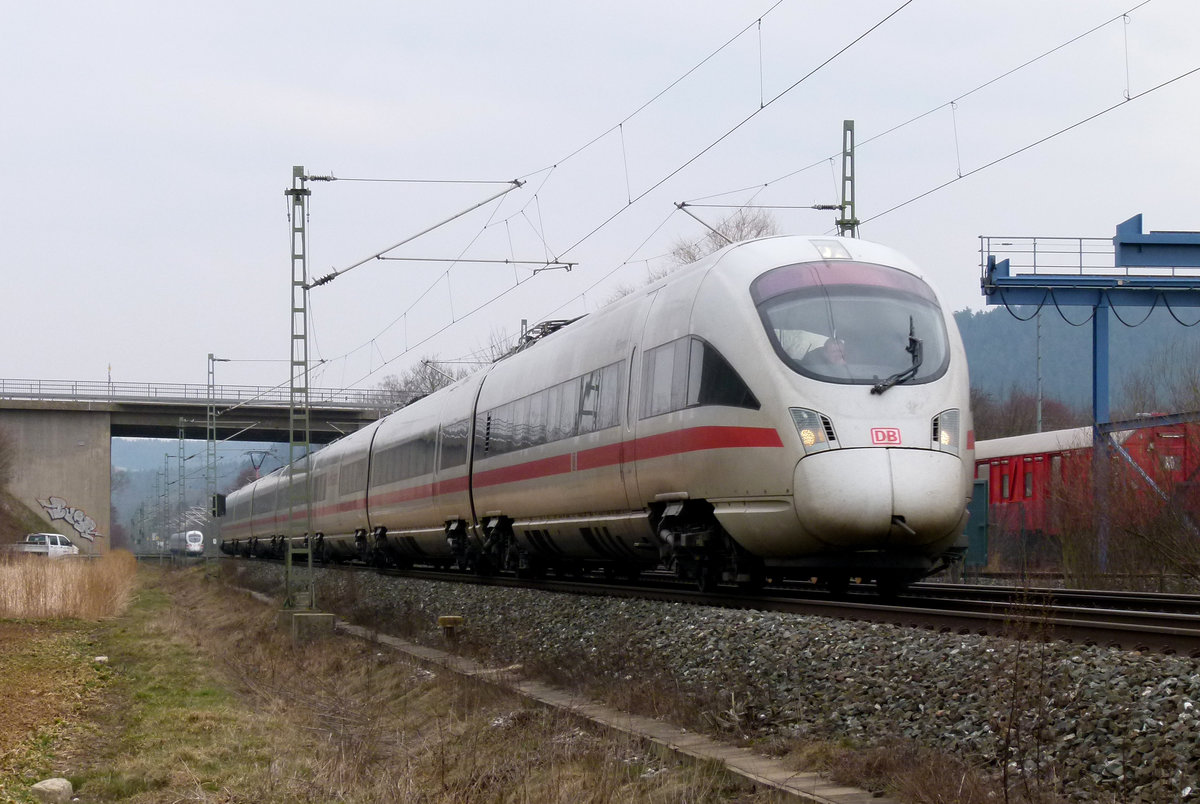 02. April 2013, ICE "Erlangen" (Tz 1117) fährt als ICE 1209 Hamburg - Berlin an der Müllumladestation Neuses in Richtung, Lichtenfels vorüber. Im Hintergrund ist ein Wagen des Hilfszuges sichtbar. Im Betriebsgelände war eine V100 übers Ziel hinausgeschossen. Jürgen Krause