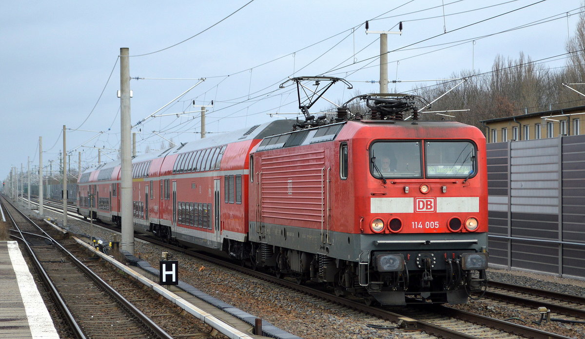 DB Regio Nordost mit "114 005" (NVR-Nummer "91 80 6114 005-2 D-DB") und dem RE5 nach Wünsdorf/Waldstadt am 19.02.21 Berlin Blankenburg. Lothar Stöckmann