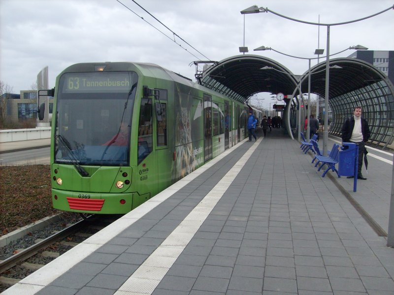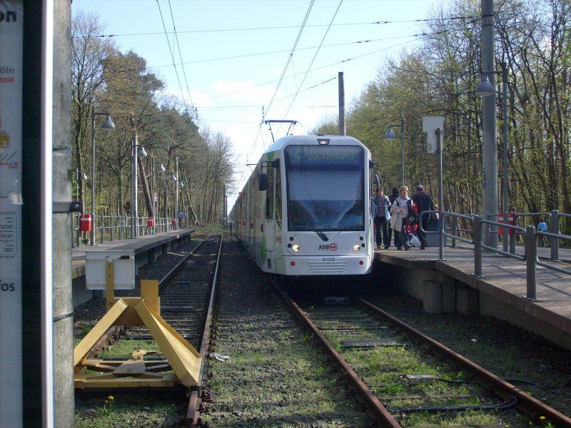 5155 - Linie 4 - Schlebusch - 20.04.2008: Soeben ist TW 5155 mit Werbung für die KölnMesse in Leverkusen- Schlebusch, an der Endhaltestelle der Linie 4, eingetroffen. Martin K.