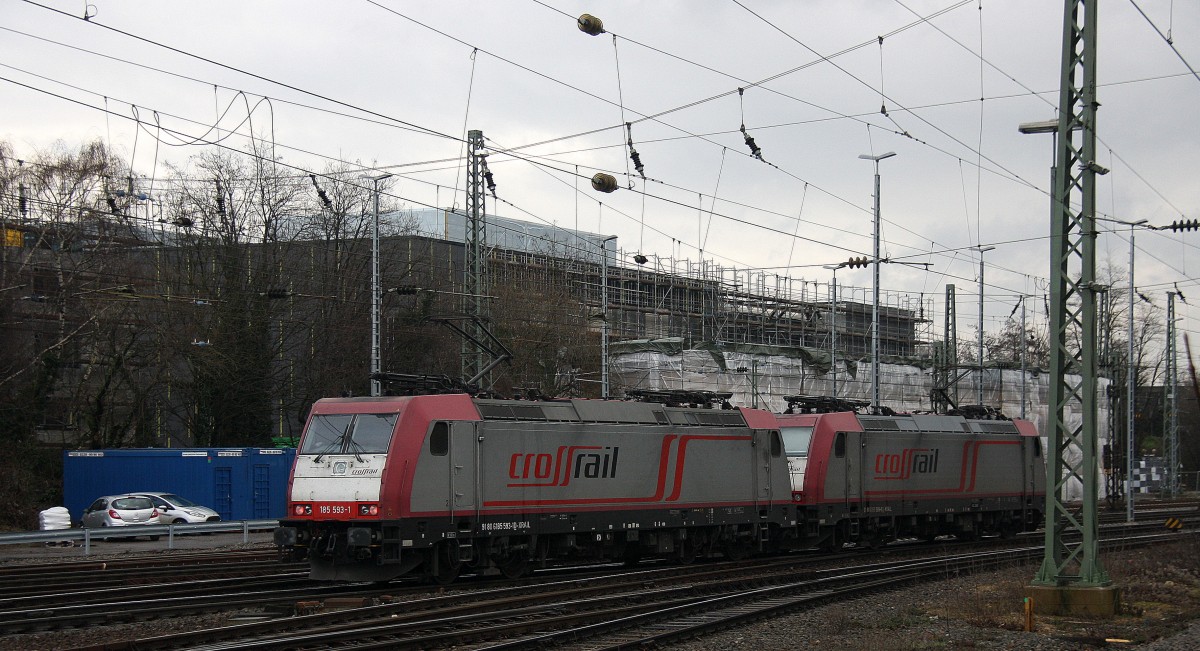 Ein Nachschuss von der 185 593-1,185 599-8 beide von Crossrail fahren als Lokzug aus Aachen-West nach Köln und fahren aus Aachen-West in Richtung Aachen-Schanz,Aachen-Hbf.