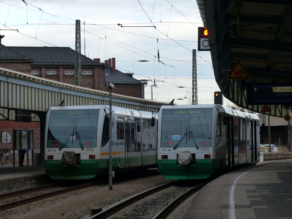 VT 32 von der Vogtlandbahn ist am 03.01.2014 mit der VBG20823 nach Sokolov unterwegs, hier bei der Ausfahrt aus Zwickau Hbf über die Olzmannbrücke. Matthias Hartmann