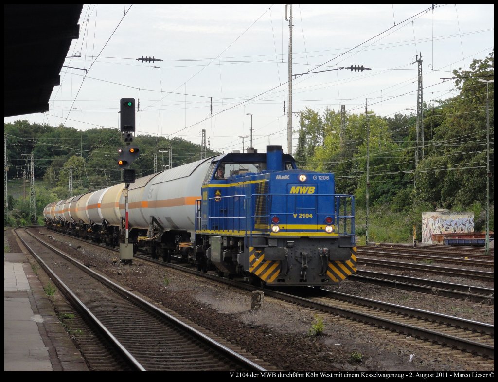 V 1203 (ex DB AG 202 725-8, ex DR 110 725-8) der Mittelweserbahn (MWB) rangiert am 17.06.2011 in Betzdorf/Sieg einen VTG Kesselwagen Zas. Die DR V100 wurde 1974 bei VEB-LEW, Hennigsdorf unter Fabrik-Nr. 14426 gebaut. Armin Schwarz