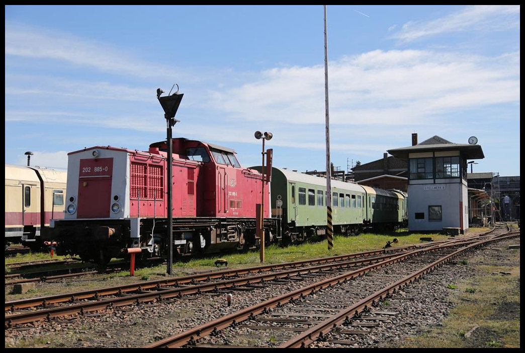202 457-8 (112 457-7 | DR V 100) der Traditionsgemeinschaft Bw Halle P e.V. steht anlässlich des Sommerfests unter dem Motto "Diesellokomotiven der ehemaligen DR" im Ringlokschuppen des DB Musems Halle (Saale).