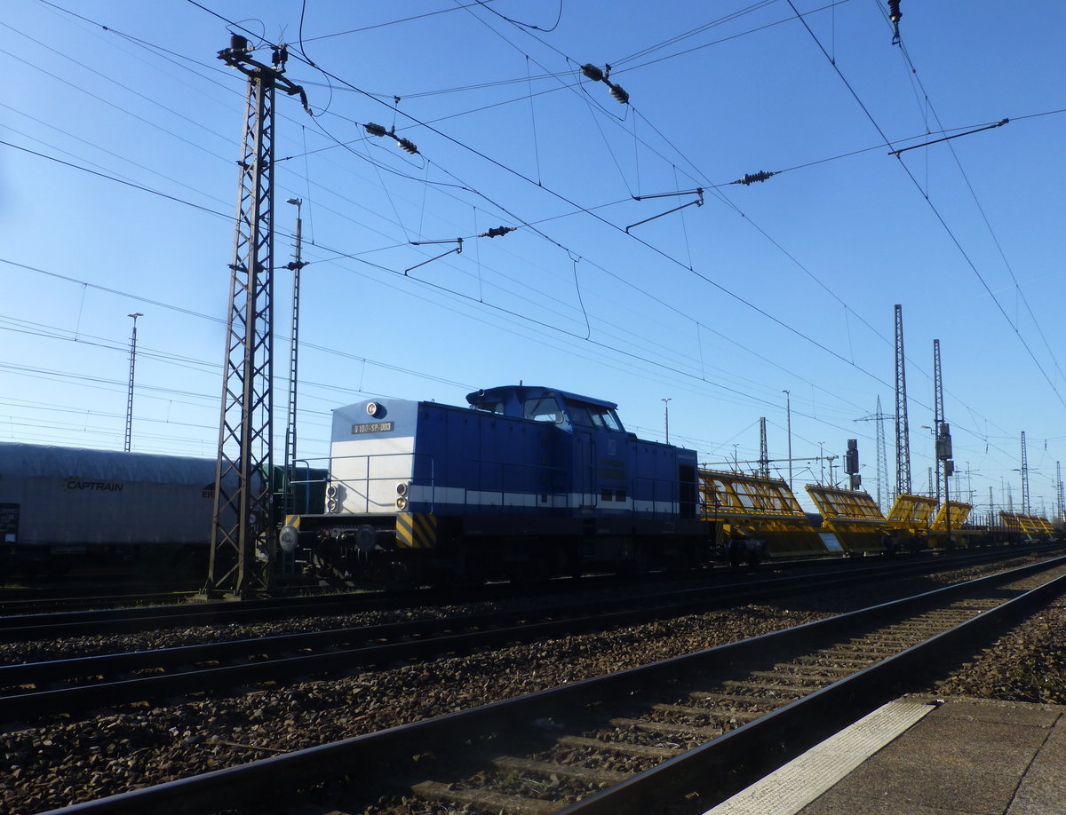 V100-SP-003 (mit NVR-Nr.98 80 3202 677-1 D-SLG), der SLG Spitzke Logistik GmbH, rauschte, mit ihrem Bau Zug, am HP Duisburg-Bissingheim vorbei. Aufgenommen am 22.03.19. Zwangsbremsung