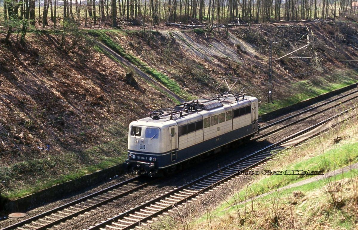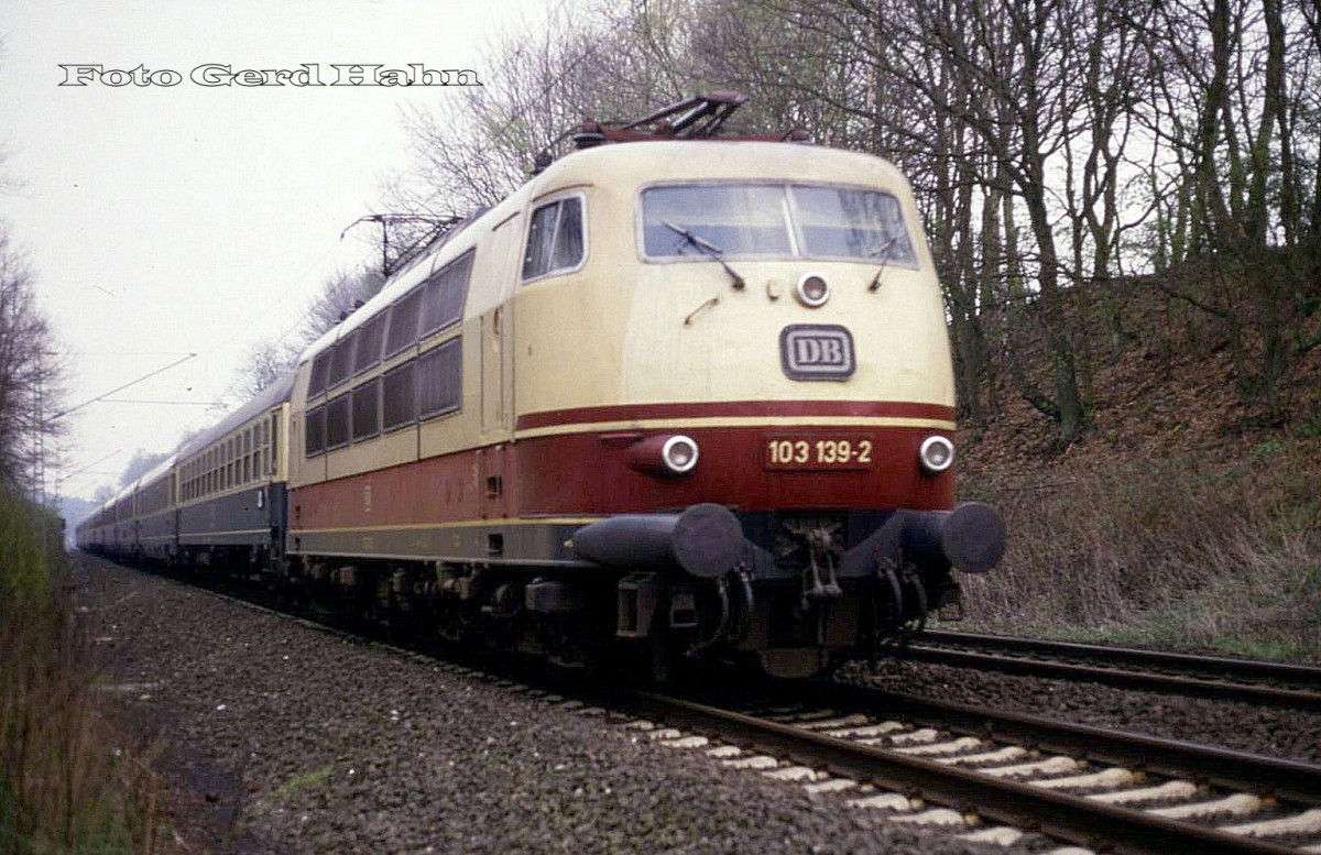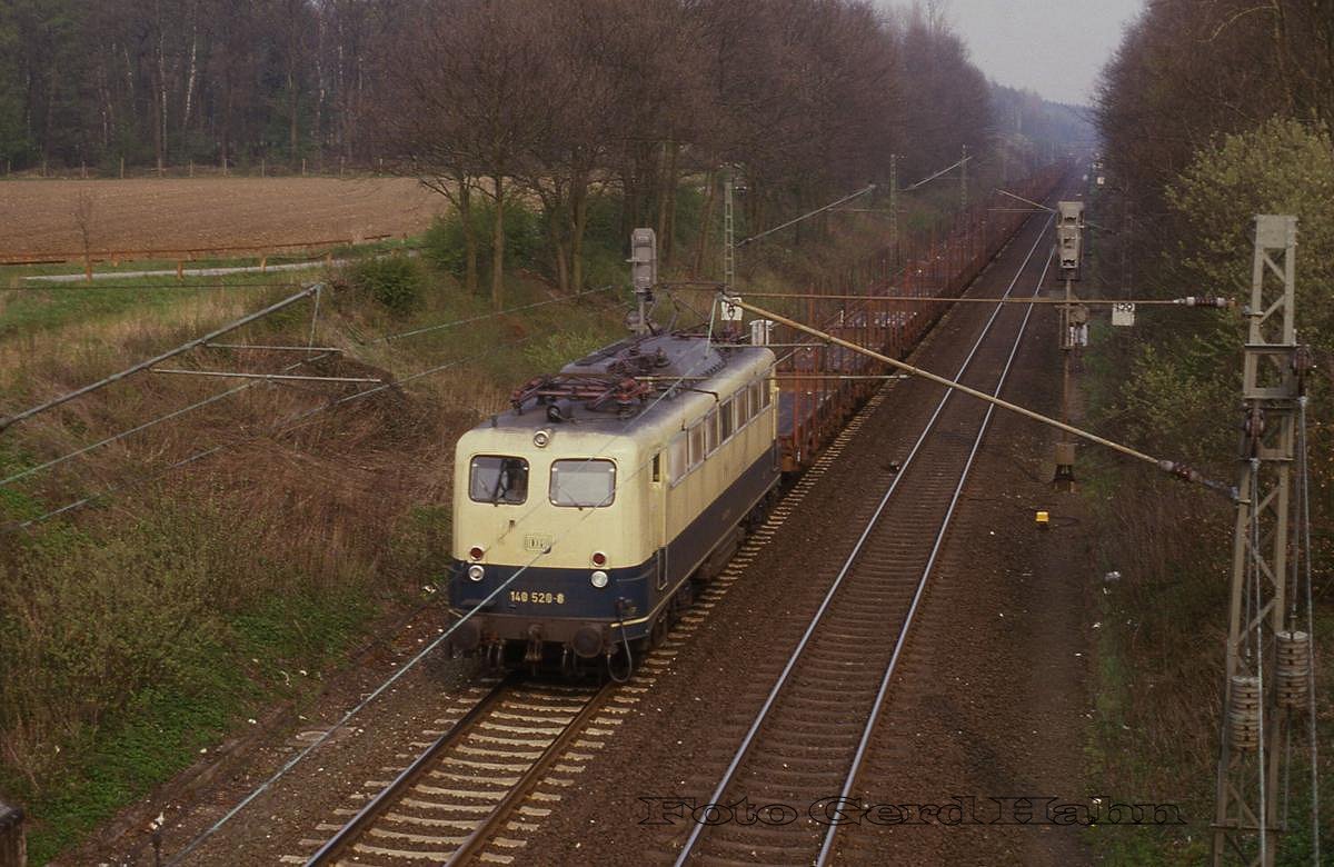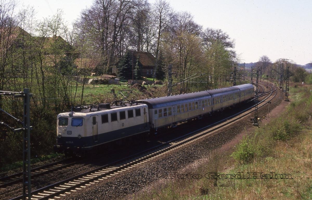 141074 hat am 24.4.1988 um 13.34 Uhr hier gerade den ehemaligen Bahnhof Vehrte durchfahren und strebt nun mit dem E 3381 weiter Bremen entgegen. Gerd Hahn