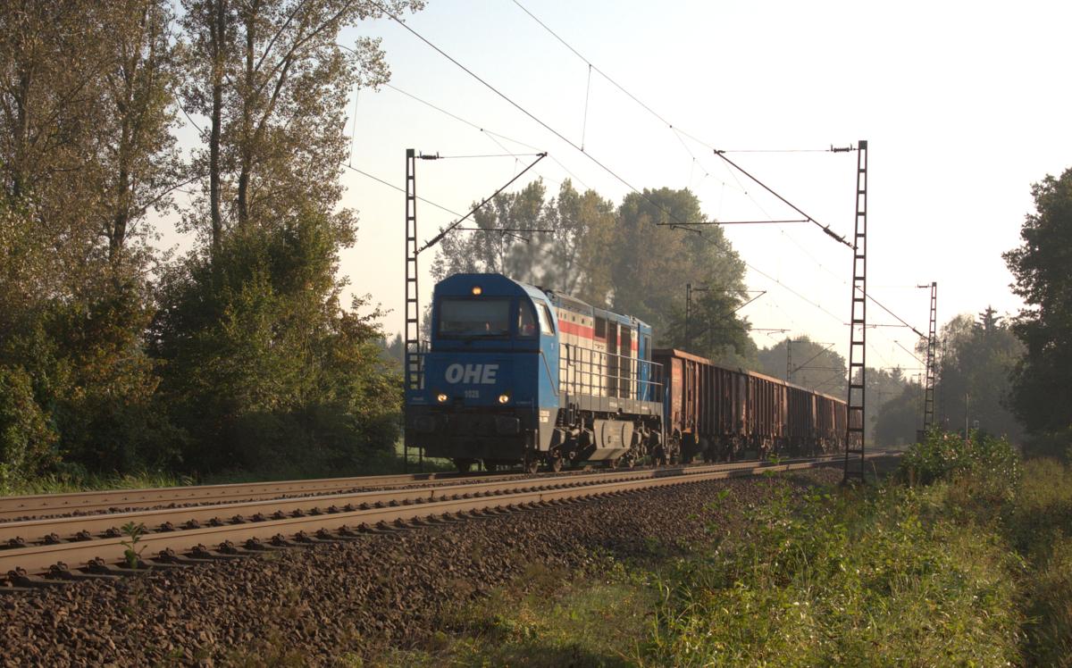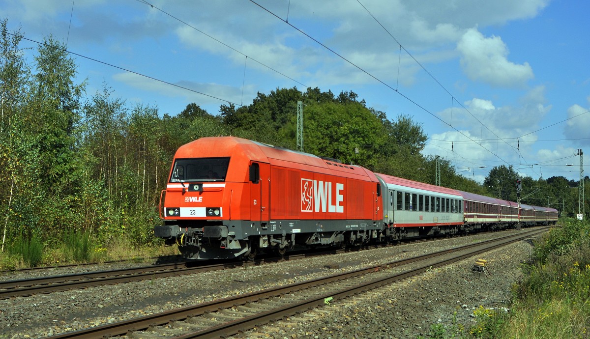 Elektrolok 81 der Westfälischen Landeseisenbahn WLE bespannte am 5.9.2014 einen Müller Sonderzug nach Lübeck. Der Zug kam mir in Osnabrück - Hörne um 10.39 Uhr vor die Linse. Gerd Hahn