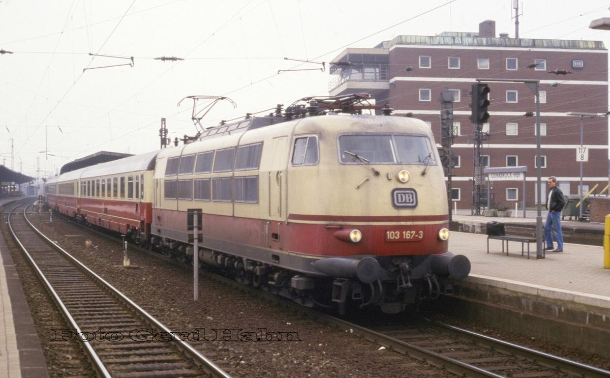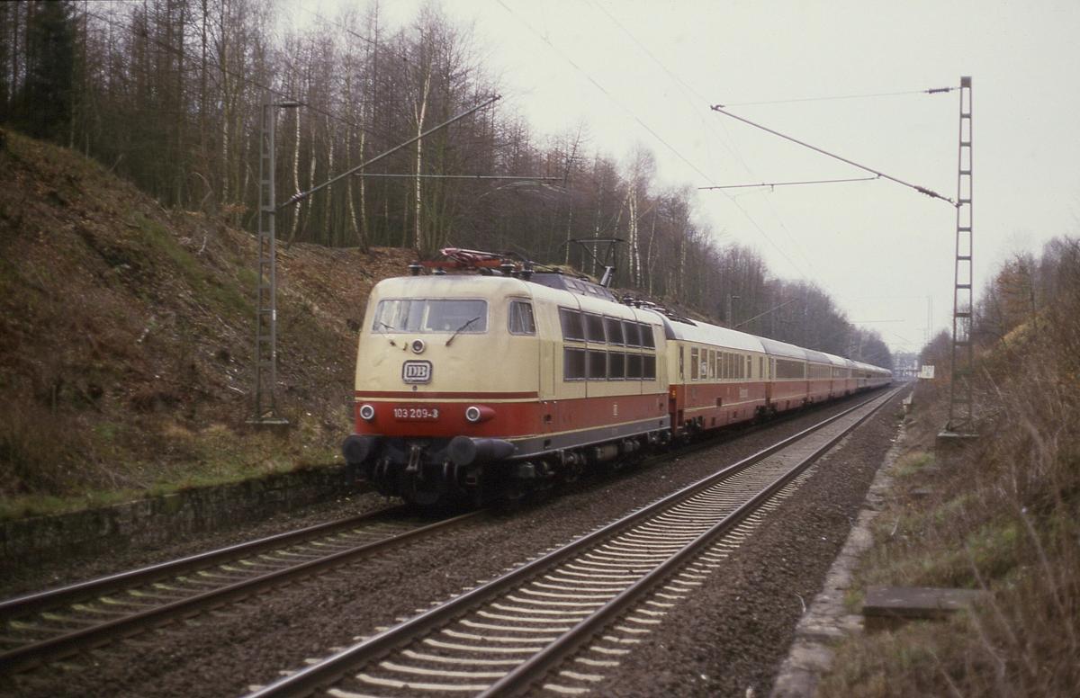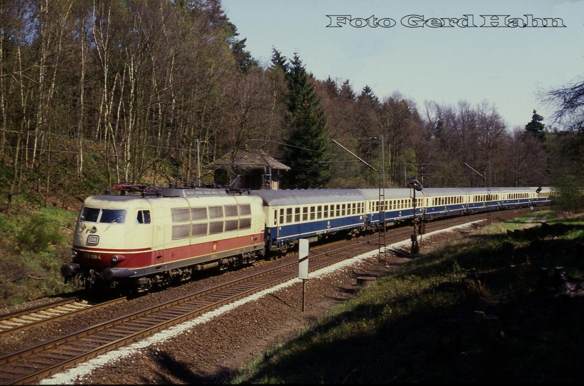 103237 passiert mit IC 601 Diplomat am 19.3.1988 um 11.24 Uhr die ehemalige Blockstelle im Wald zwischen Vehrte und Ostercappeln. Von hier hat der Zug noch knapp fünf Minuten, bis zum Hauptbahnhof Osnabrück zurück zu legen. Gerd Hahn
