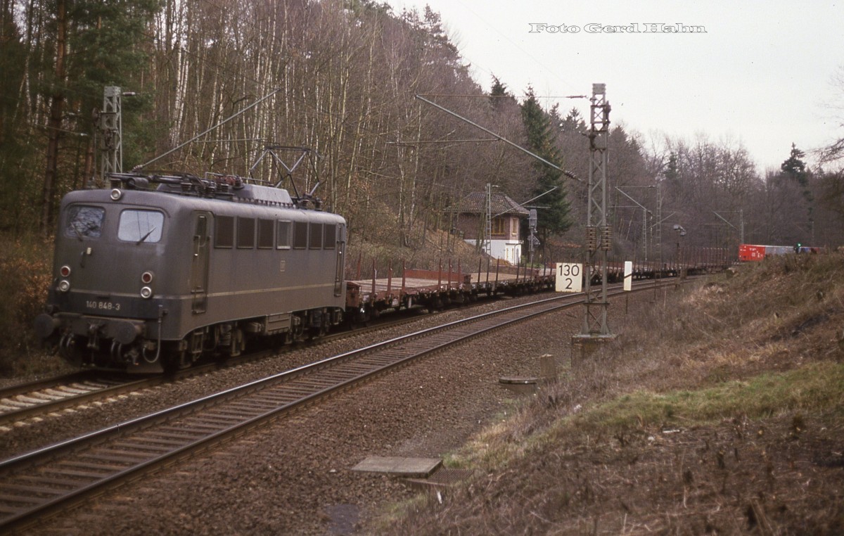 Am 9.12.1987 war noch nicht die Zeit der vielen Ganzzüge, wie man es heute beobachtet. Damals wurden Neuwagen auch noch in gemischten Güterzügen in kleineren Einheiten transportiert. Das sieht man heute sehr selten. Um 14.24 Uhr kam 140529 mit einem solchen Zug durch Osnabrück Hörne in Richtung Osnabrück. Gerd Hahn