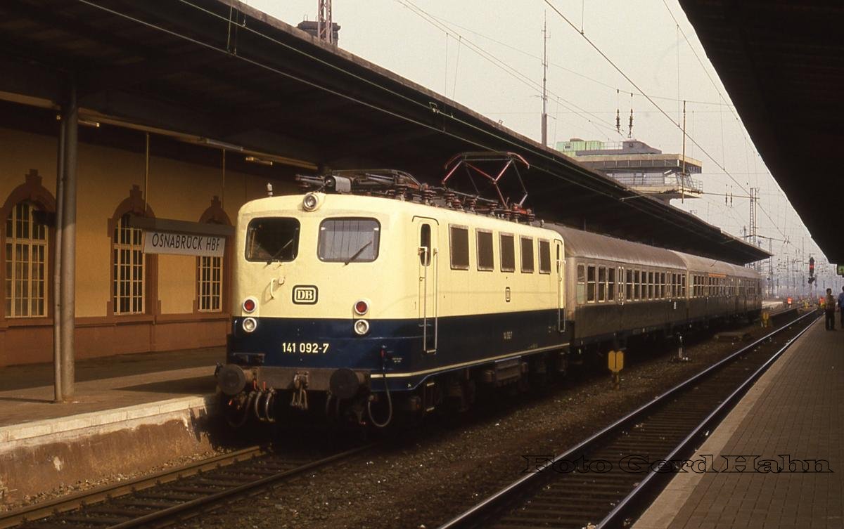Das war über viele Jahre die Standardgarnitur für den Nahverkehr zwischen Münster und Osnabrück. Auf Gleis 1 steht abfahrbereit am 5.4.1988 um 11.43 Uhr die 141092 mit dem N 8614 nach Münster. Gerd Hahn