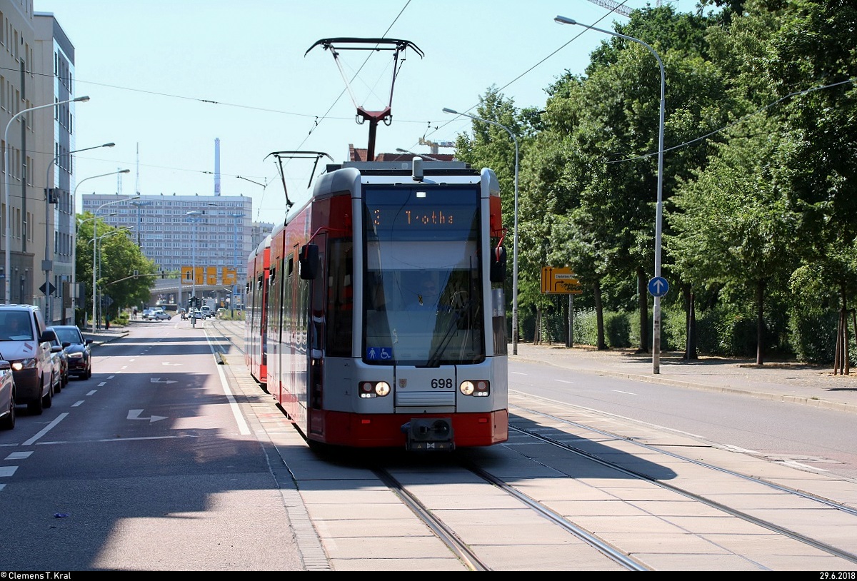 MGT-K-2 (Bombardier Flexity Classic), Wagen 698 und Wagen ???, der Halleschen Verkehrs-AG (HAVAG) als Linie 3 von Beesen nach Trotha erreichen die Haltestelle Magdeburger Straße.