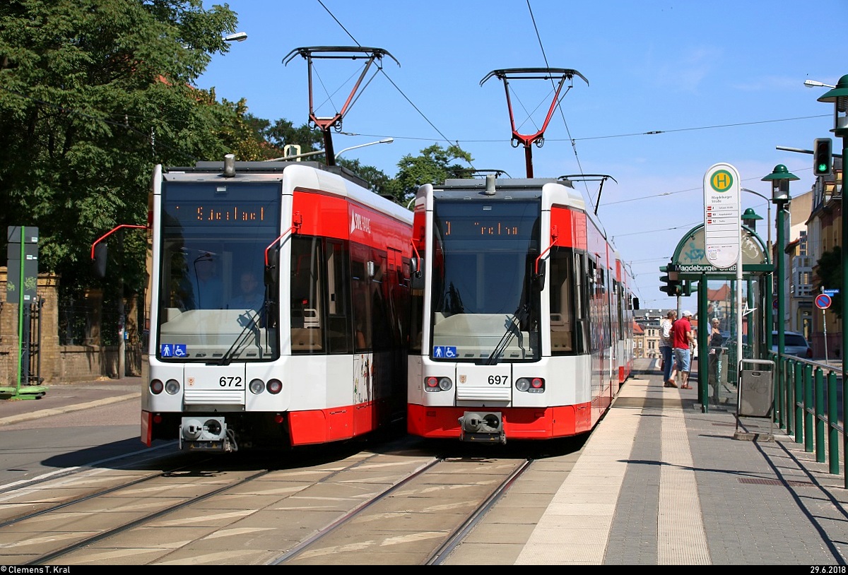 MGT-K (Bombardier Flexity Classic), Wagen 672 und Wagen 6??, der Halleschen Verkehrs-AG (HAVAG) als Linie 1 von Frohe Zukunft nach Südstadt, Veszpremer Straße, treffen auf MGT-K-2, Wagen 698 und Wagen ???, als Linie 3 von Beesen nach Trotha an der Haltestelle Magdeburger Straße.