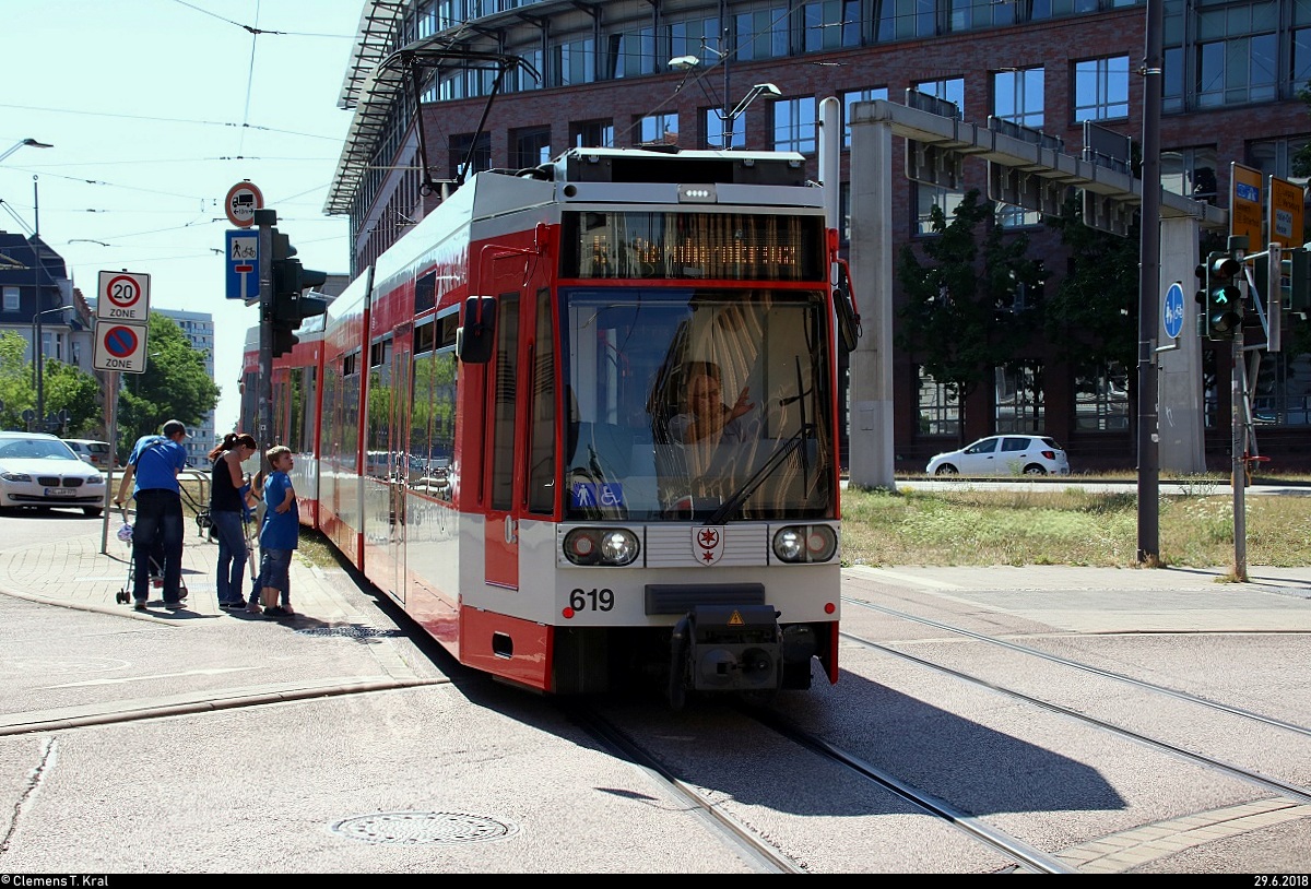 MGT6D, Wagen 619, der Halleschen Verkehrs-AG (HAVAG) als Linie 5 von Ammendorf nach Rennbahnkreuz erreicht die Haltestelle Am Leipziger Turm. Der Fahrer grüßt soeben seinen entgegenkommenden Kollegen.