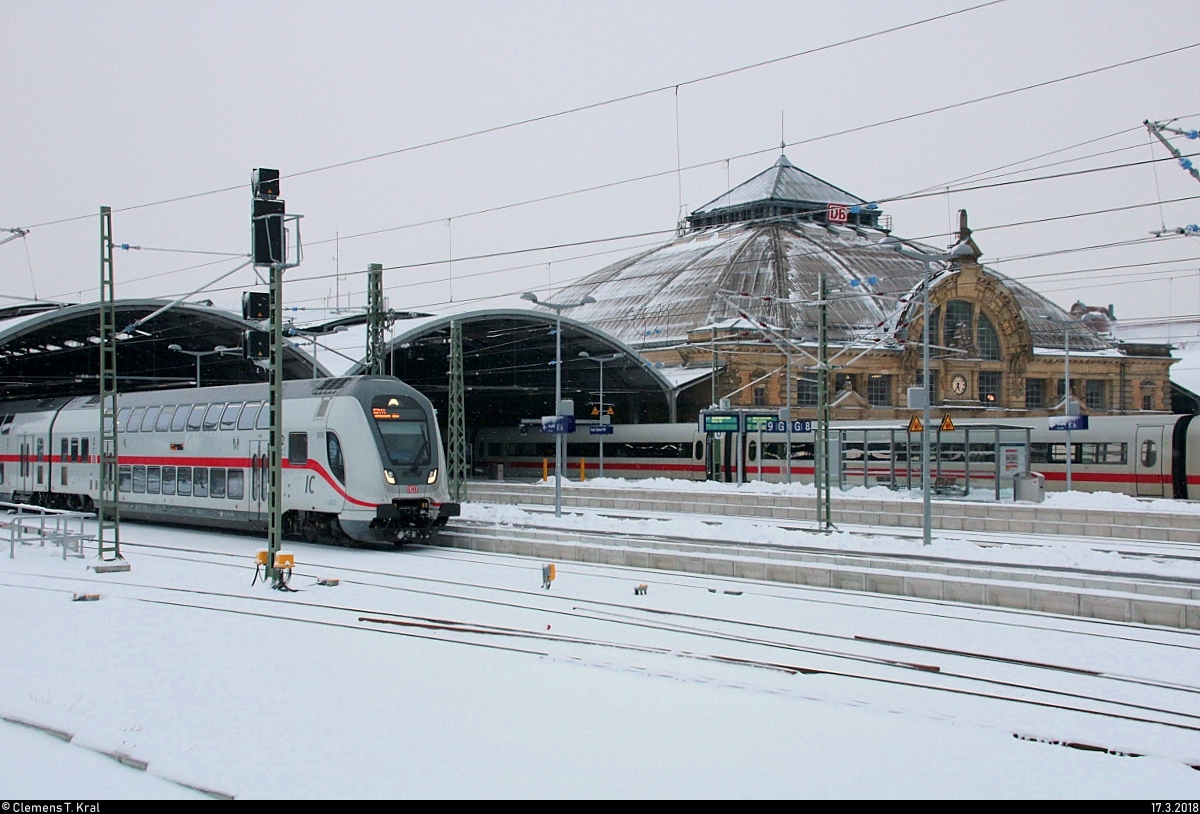 Blick auf die verschneiten Gleise von Halle(Saale)Hbf mit DBpbzfa 668.2 als verspäteter IC 2444 (Linie 55) von Dresden Hbf nach Hannover Hbf abweichend auf Gleis 11 und einem ICE im Hintergrund. [17.3.2018 | 17:37 Uhr] Clemens Kral