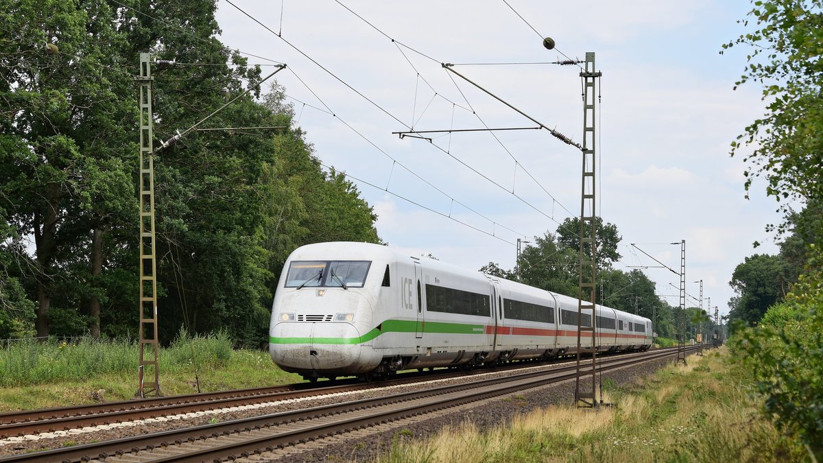 In der Kramerkurve (oder auch "Schweineohr"; Überfahrt von der Anhalter Bahn zum Berliner Außenring) fährt ein ICE2-Doppel (vorne: "Bergen auf Rügen", hinten "Rheinsberg"). Leider ist der führende TK im Schatten - die Wolkenlotterie habe ich zu diesem Zeitpunkt verloren. Ziel ist wahrscheinlich B-Rummelsburg.
