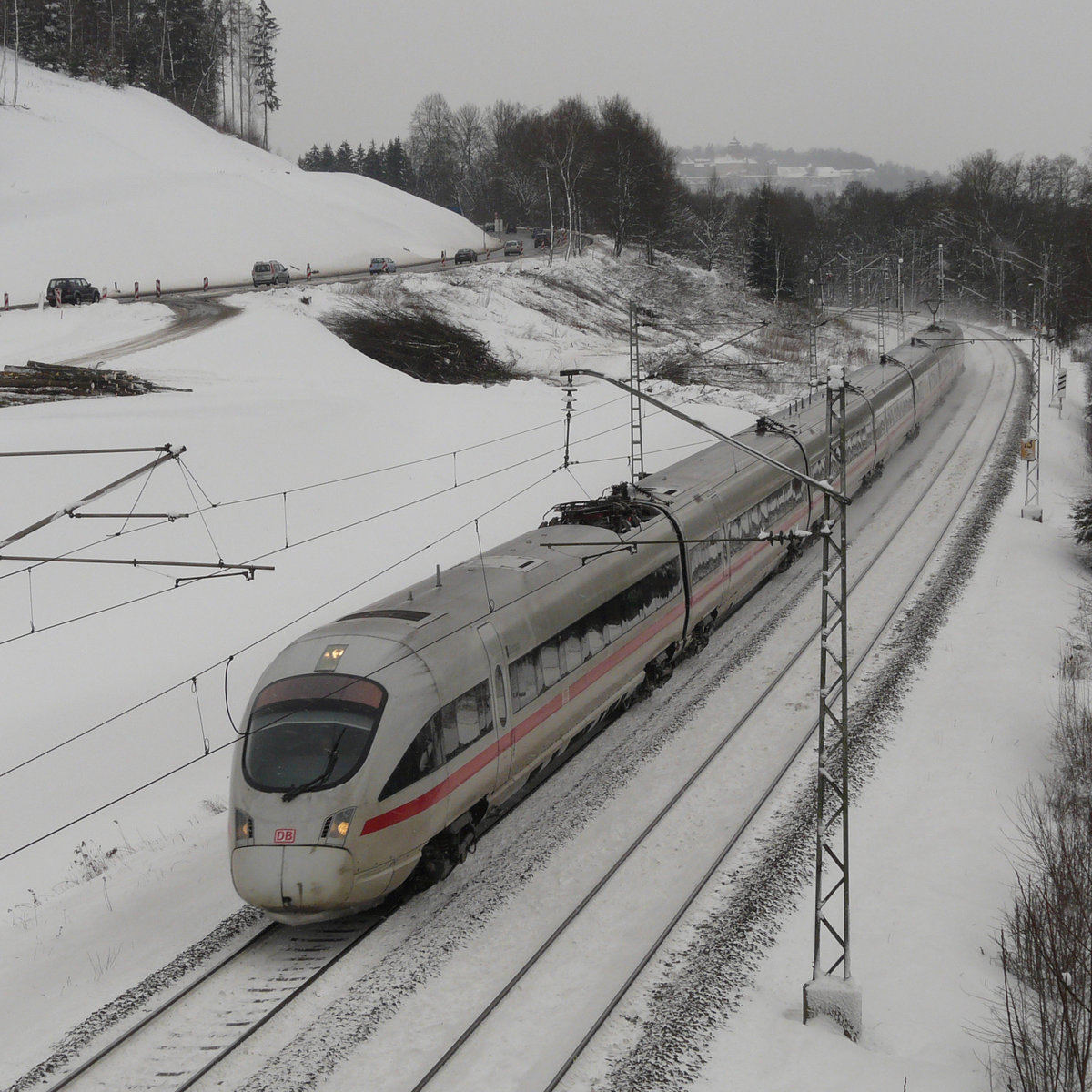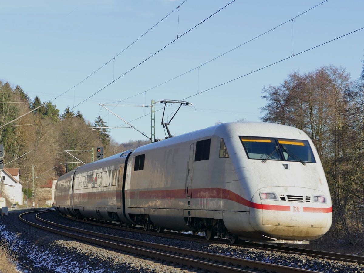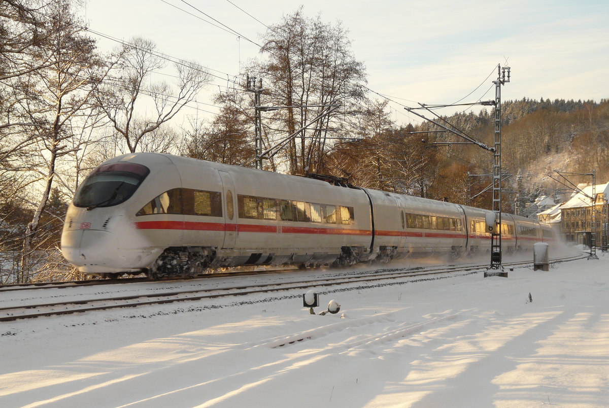 19. März 2011, ICE "Lüneburg" (Tz 120) fährt als ICE 915 Berlin - München am Ende der Frankenwaldbahn durch die Zettlitzer Kurve in Richtung Lichtenfels
