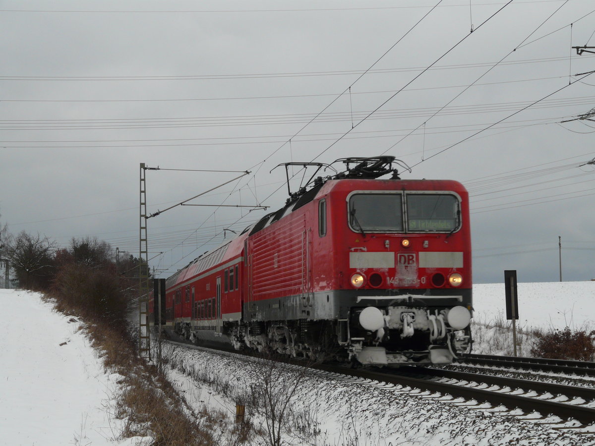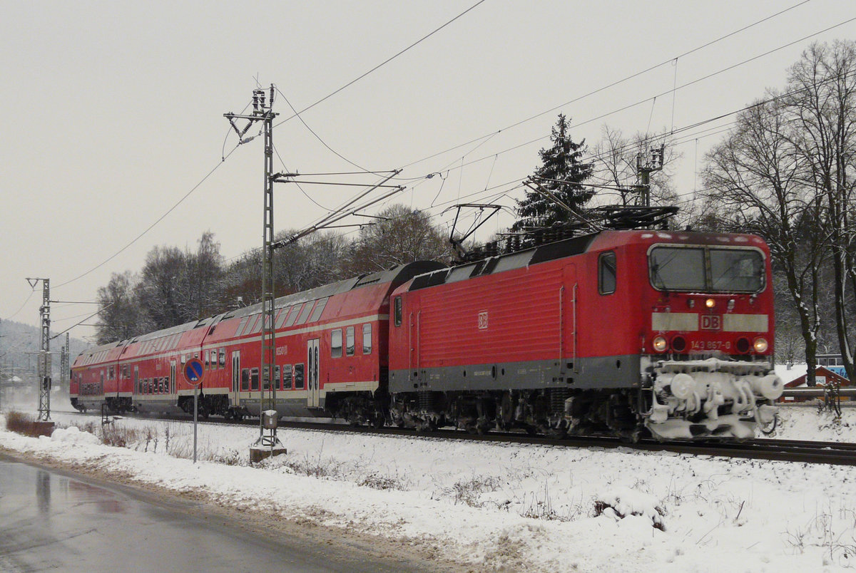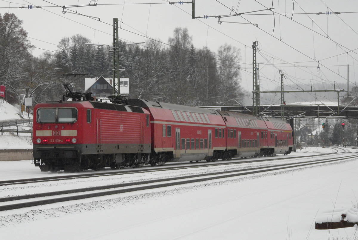 29. Januar 2010, RB 16855 nach Naumburg beginnt ihre Fahrt wegen Bauarbeiten auf der Strecke von Lichtenfels heute in Kronach. Lok 143 610 nimmt eine Viertelstunde Verspätung mit auf die Reise über den verschneiten Frankenwald.