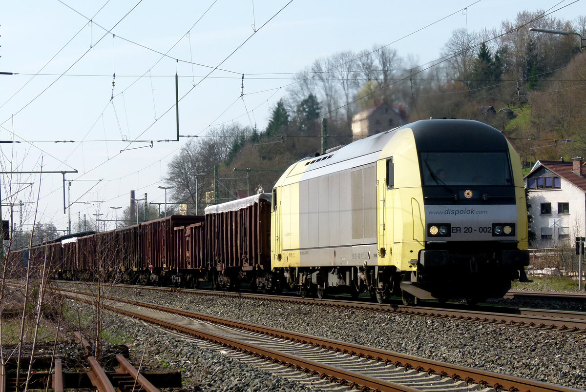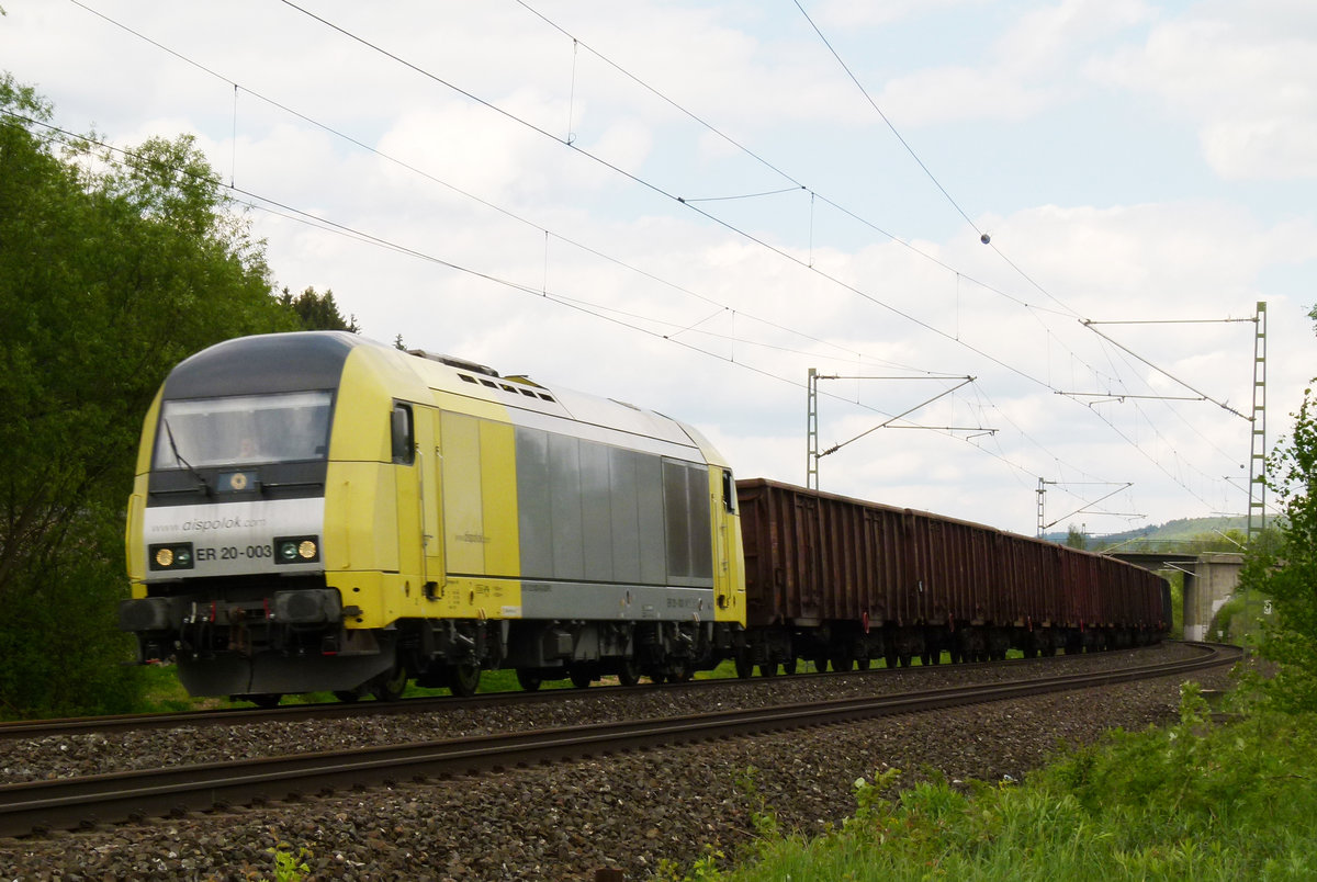 08. Mai 2012, Ein Güterzug aus Saalfeld mit der Dispo-Lok ER 20-003 fährt durch den Haltepunkt Neuses bei Kronach in Richtung Lichtenfels.