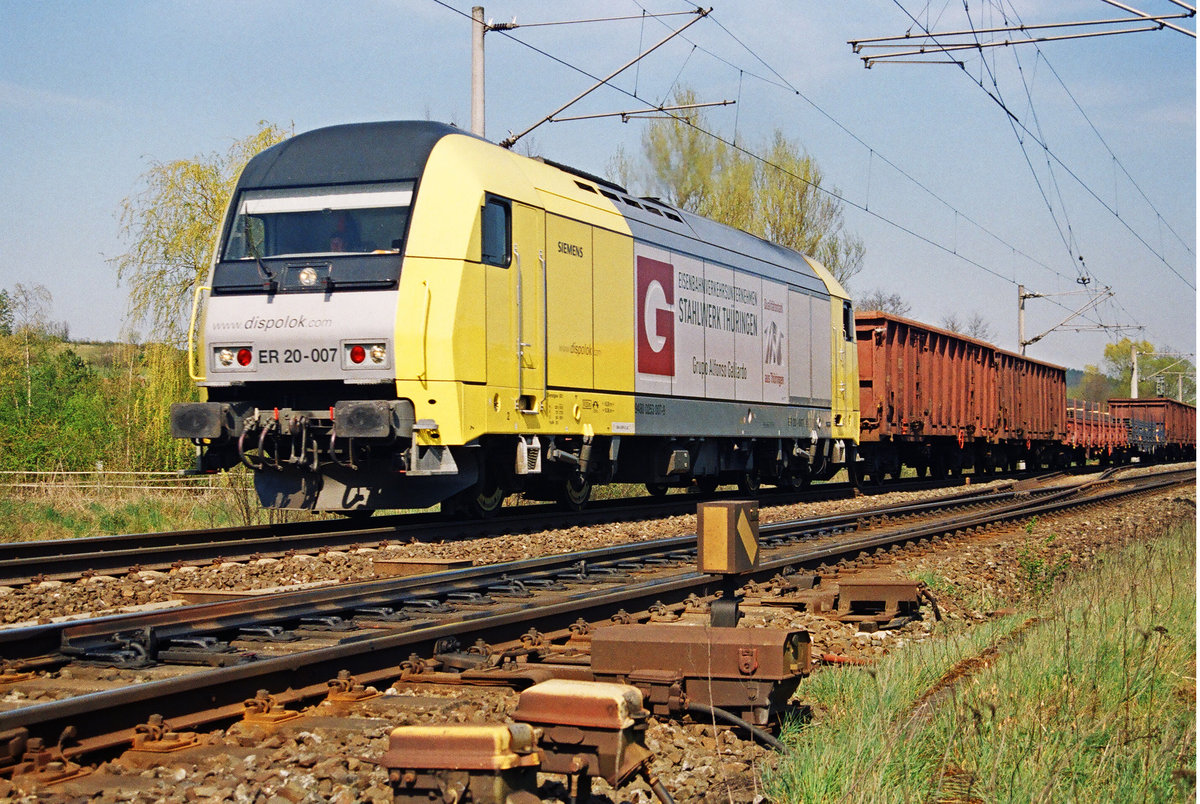 13. April 2007, Bei Küps, die Siemens-Dispolok ER 20-007, eingestellt beim Eisenbahnverkehrsunternehmen Stahlwerk Thüringen fährt mit ihrem Güterzug aus Unterwellenborn in Richtung Hochstadt.