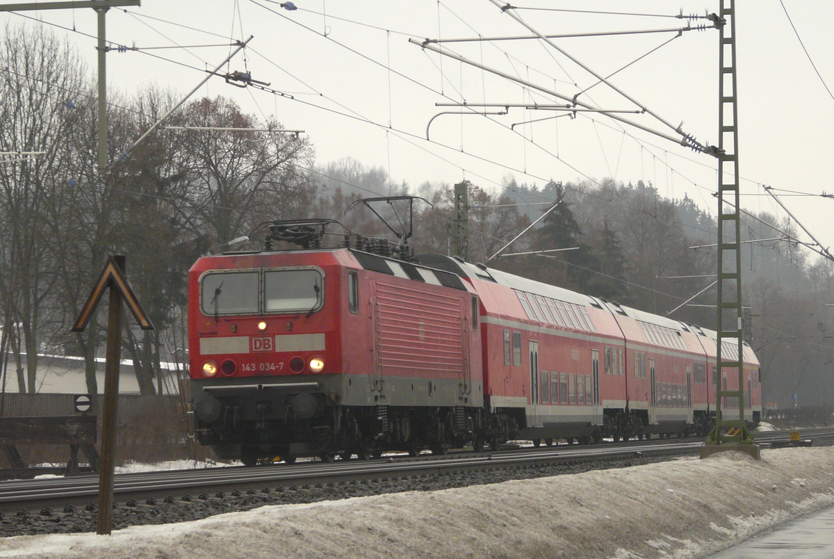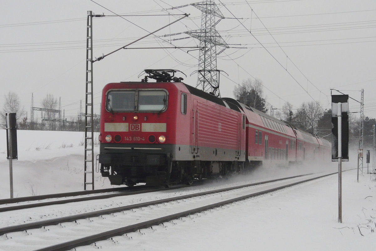 31. Januar 2010, 143 610 kommt mit RB 16849 trotz der aktuellen Schneebedingungen nach ihrer Fahrt von Naumburg über den Frankenwald pünktlich an meinem Fotostandpunkt bei Redwitz vorbei.