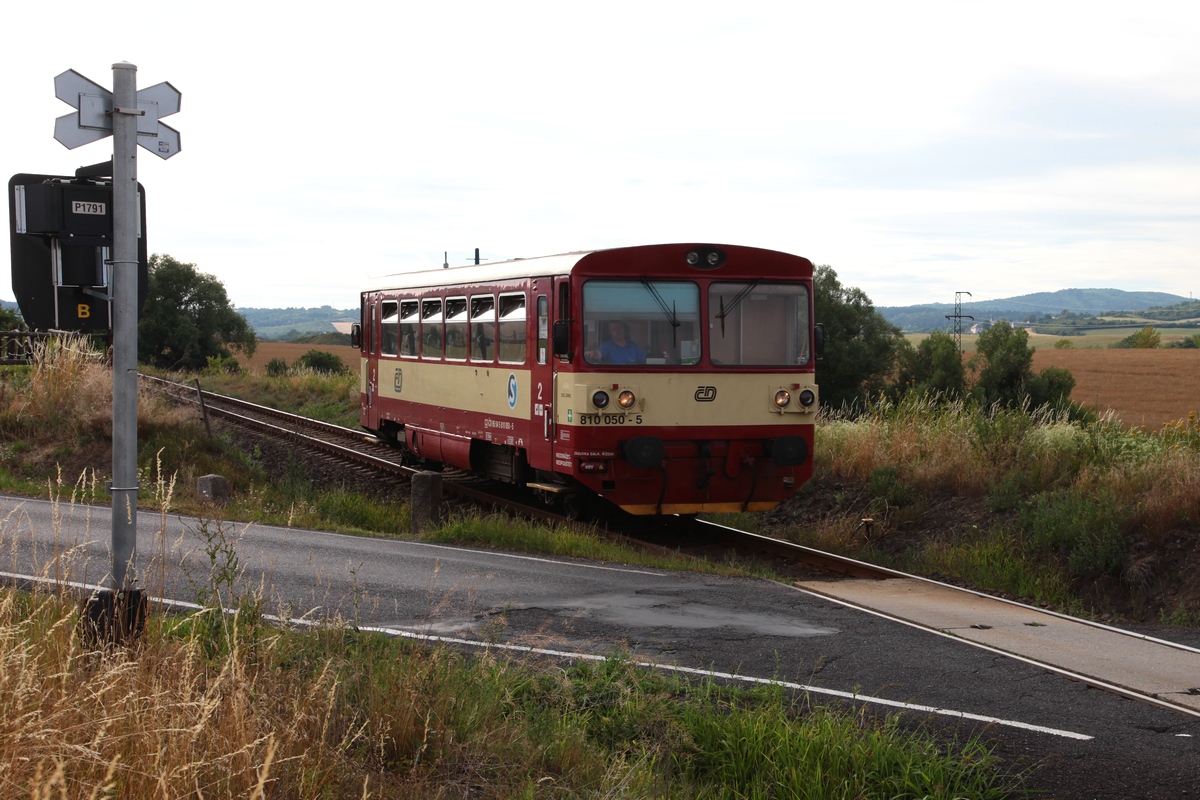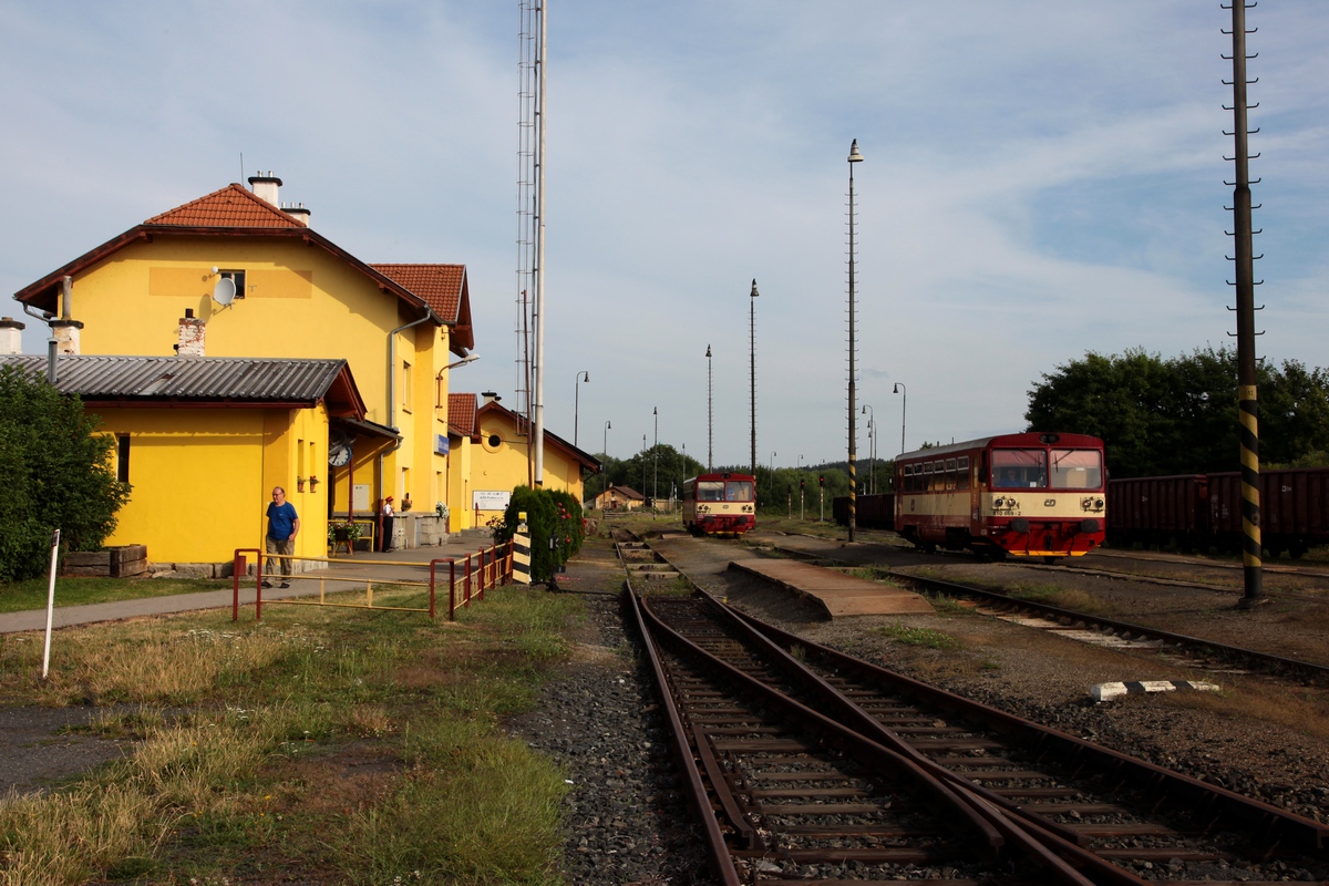 Bf Blatno u Jesenice am 22.07.2019. 810 669 fährt soeben, als Os16707 nach Rakovník, aus und 810 304 wartet auf den weiteren Einsatz, er war als Os16722 aus Rakovník gekommen. Rüdiger Ulrich