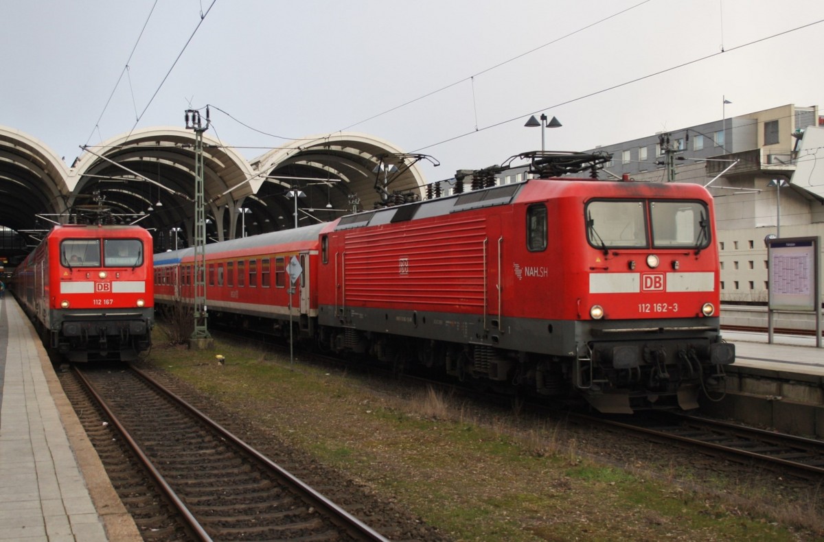 Hier links 112 167 mit einem RE70 (RE21027) von Kiel Hbf. nach Hamburg Hbf. und rechts 112 162-3 mit einer RB77 (RB21127) von Kiel Hbf. nach Neumünster, diese beiden Züge begegneten sich am 23.2.2016 in Kiel Hbf. Alexander