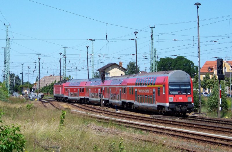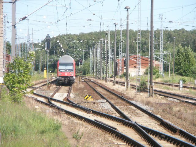 Durch Bestensee am 20.06 um 10:46. Im Hinter Grund zeigt die Ausfahrt schon wieder grün, und wenn der RE weg ist wird auch aus Norden noch ein Zug kommen, dass hat die Autofahrer am BÜ sehr verärgert:D! Alexander Wiemer