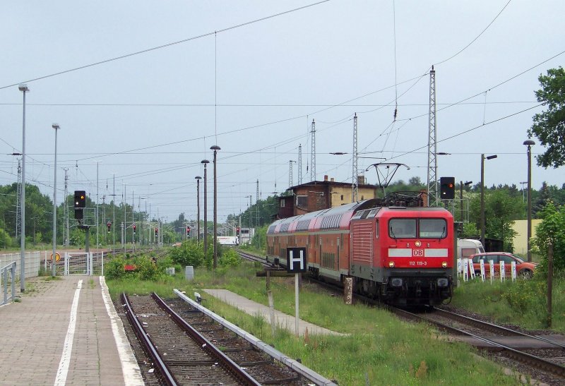 112 189-6(BW Cottbus)mit RE38591 von Warnemünde nach Berlin Hbf (tief)abgestellt am Gleis 1 im Warnemüder Bahnhof.Aufgenommen am 06.06.09 Stefan Pavel