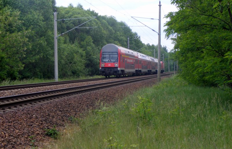 Grün und Rot ein Kontrast: RB 14 von Falkensee nach Senftenberg am 31.05 zwischen Groß Köris und Bestensee, hinten schiebt 143 193-1. Alexander Wiemer