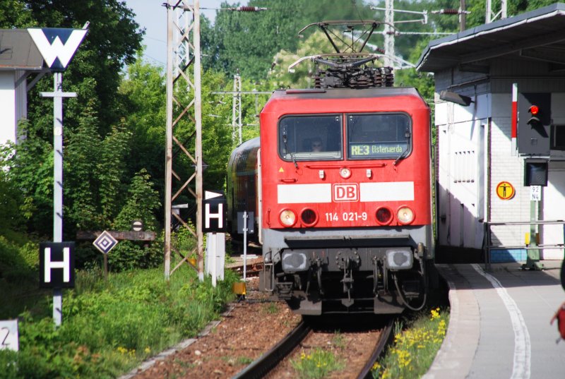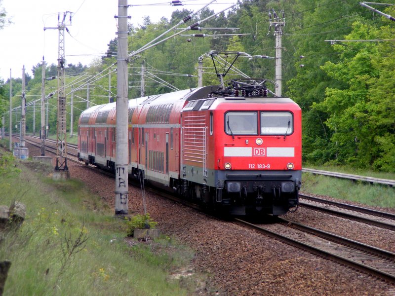 RE 2 nach Rathenow mal wieder, aber an einer anderen Fotostelle. Der Zug fährt gerade mit voller Geschwindigkeit durch die Kurve. Schublok war die 112 103-4 am 12.05. Alexander Wiemer
