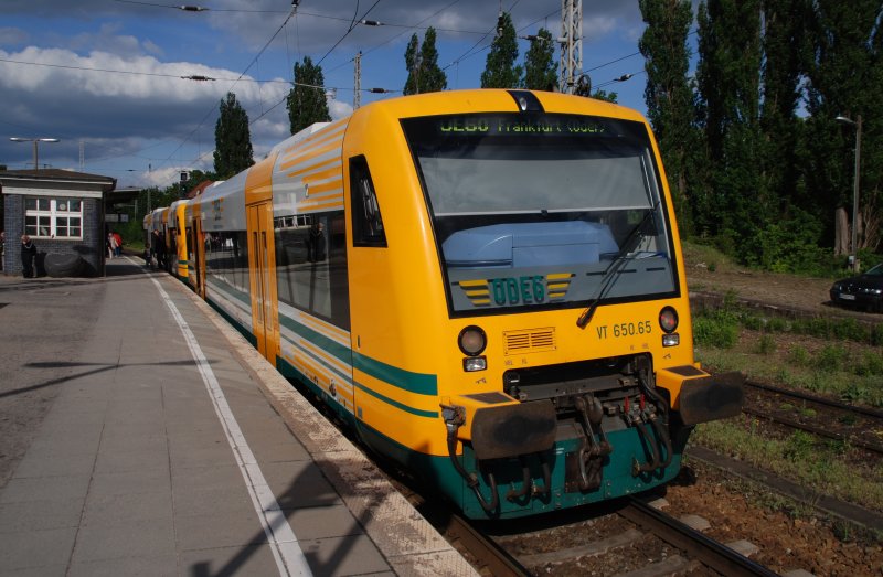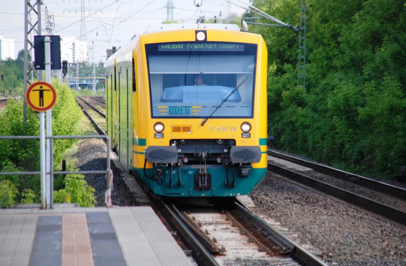 Mit einer betrachtlichen Verspätung von 65 Minuten und dem Applaus der Reisenden kommt hier der RE2 von Rathenow nach Cottbus in den Lübbenauer Bahnhof eingefahren. 09.05.2009 Hannes Müller