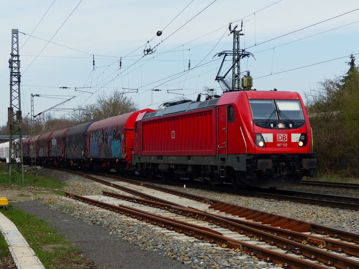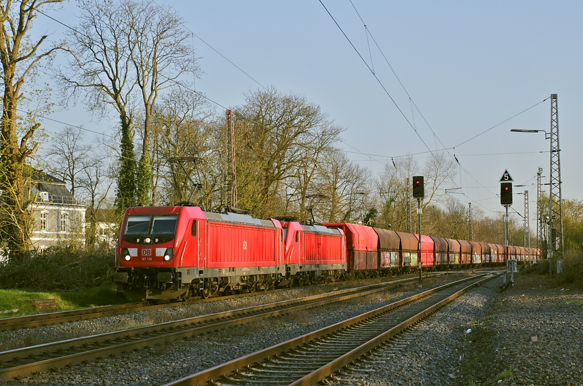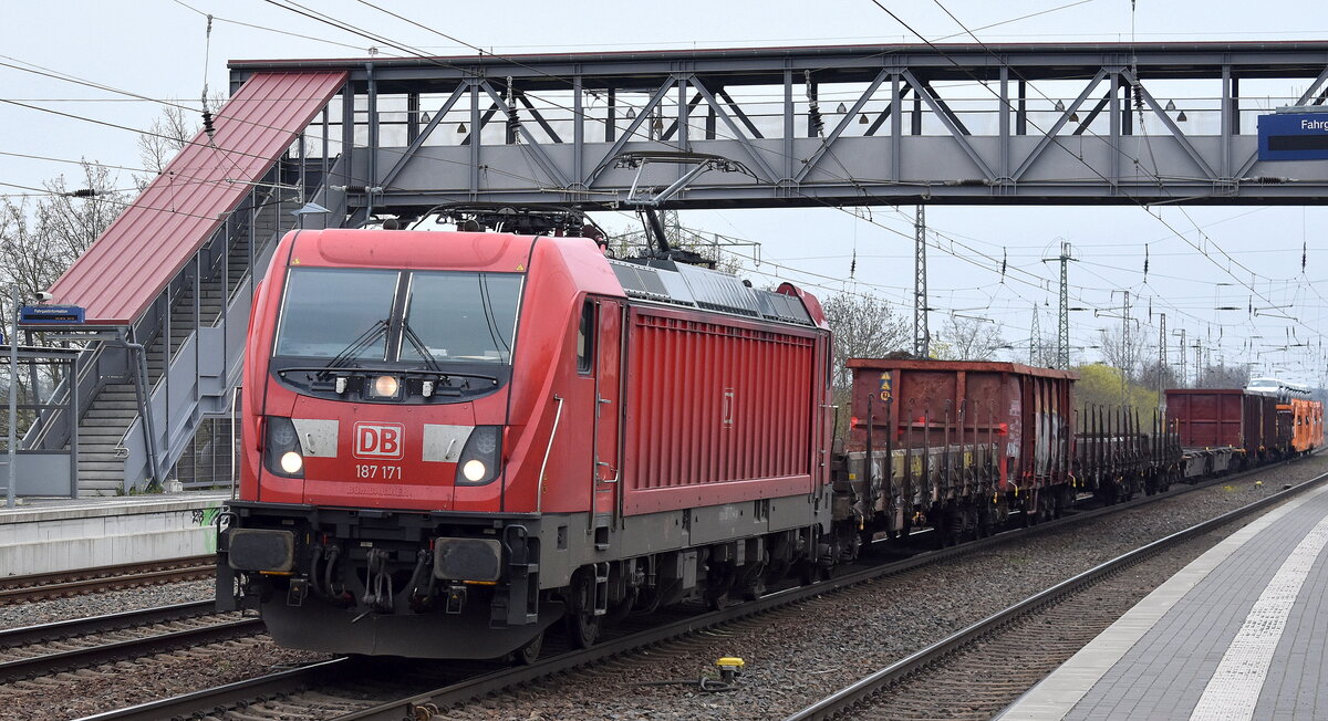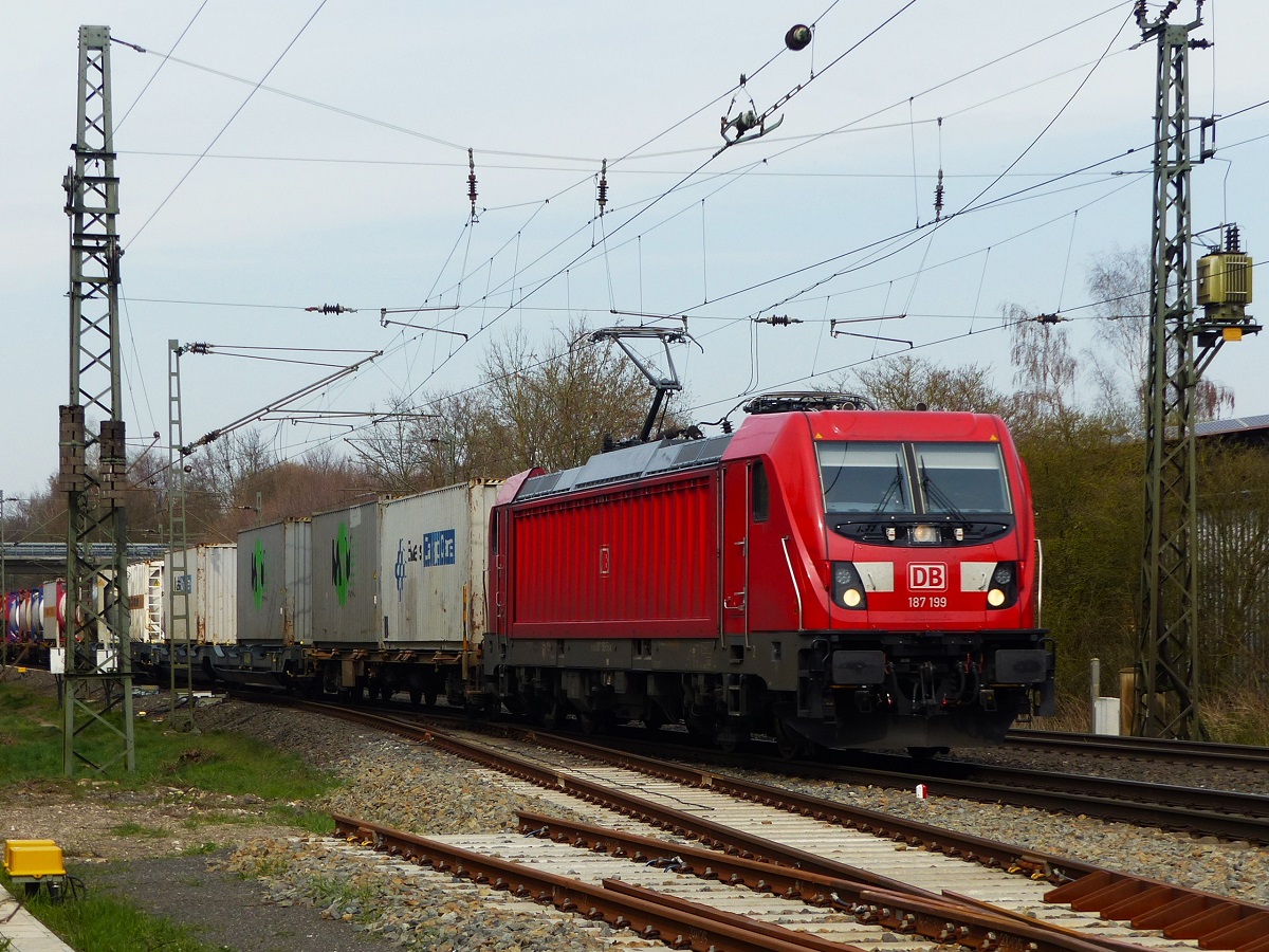 In Lengerich Schollbruch war am 28.3.2023 um 16.06 Uhr die moderne DB 187163-1 mit einem Güterzug in Richtung Münster auf der Rollbahn unterwegs. Gerd Hahn