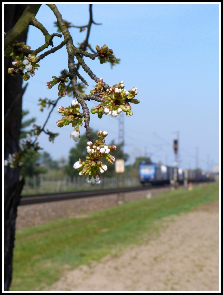 Am 29.3.14 wurde die bis dahin schon recht bunte Landschaft noch mit einer ebenfalls bunten Werbelok der DB ergänzt: Nämlich der 185 152