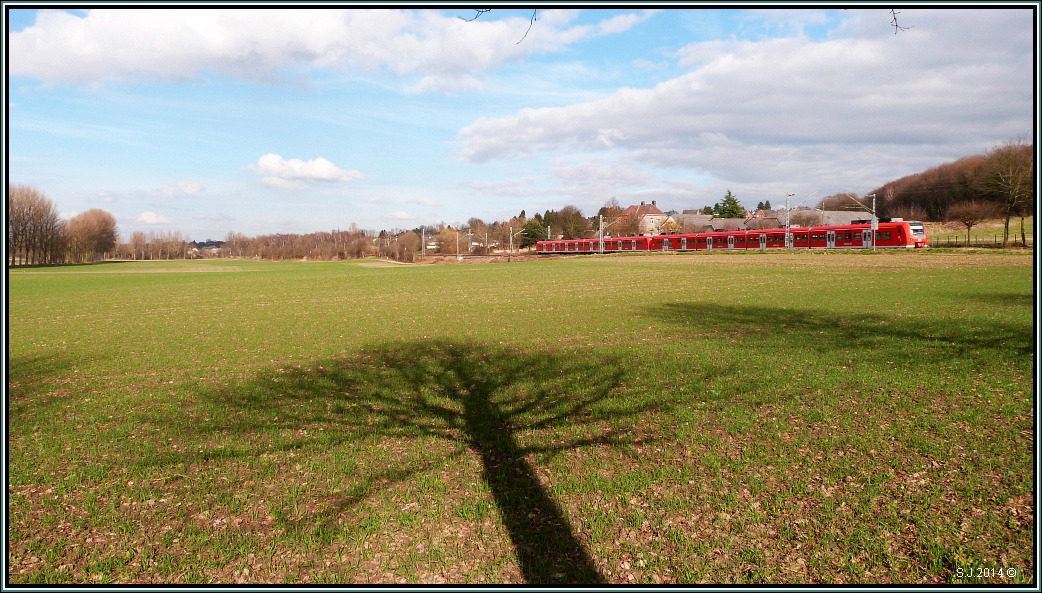 Noch ist der Baum recht nackt und wirft seinen Schatten ins Bild,die Rhein Niers Bahn macht sich unterdessen auf der KBS 485 nach Duisburg weiter. Landschaftsaufnahme aus Rimburg an der deutsch - niederländischen Grenze bei Übach Palenberg Anfang März 2014. Stefan Jakab