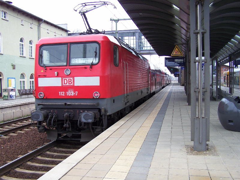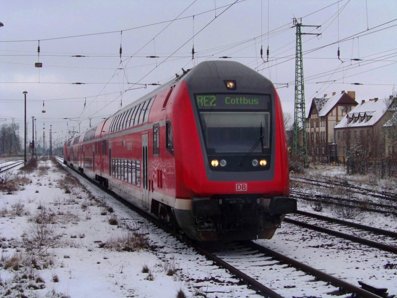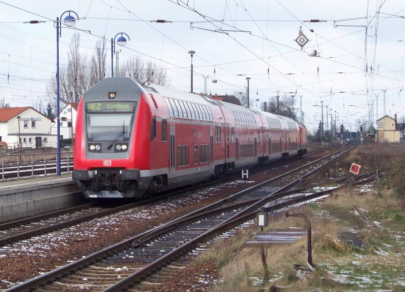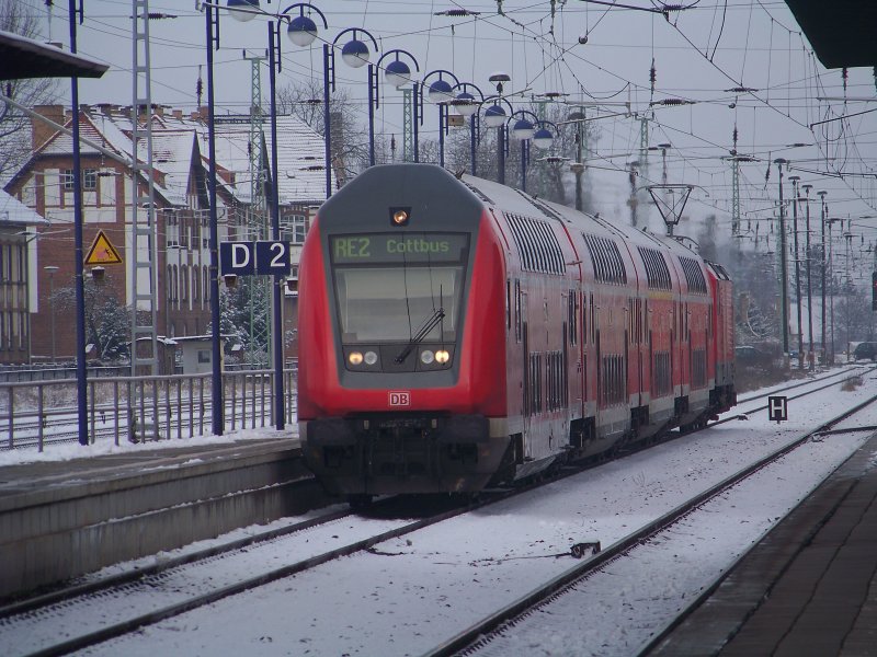 Am Gleis 1 (im Abschnitt E bis C) steht bereit der RE2 nach Rathenow über Lübben/Spreewald und Berlin. 112 188-8 ist als Lok zu erkennen. Lübbenau/Spreewald den 16.02.2008 Hannes Müller