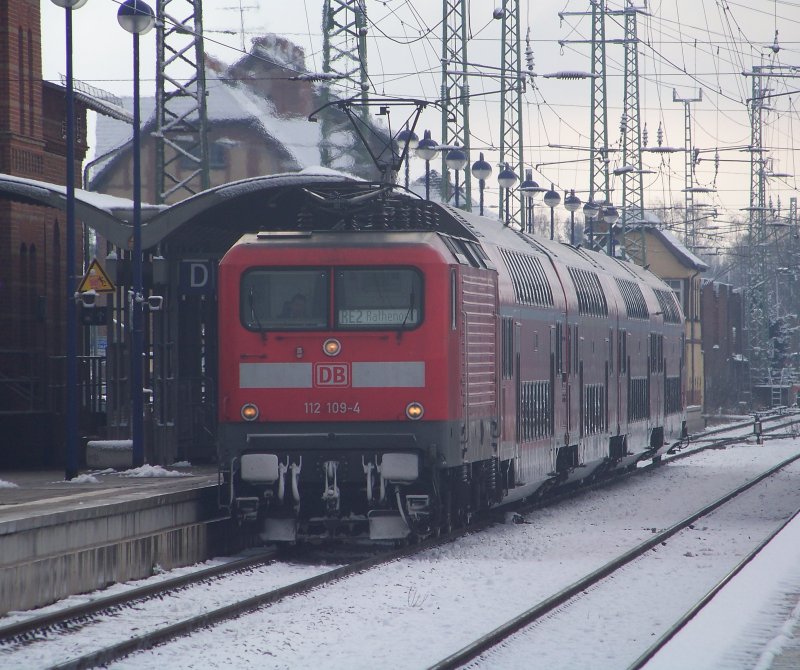 Im winterlichen Spreewald fährt los der RE2 (RE 38136)von Cottbus nach Rathenow. Es treibt ihn 112 109-4 an. Lübbenau/Spreewald den 20.03.2008 Hannes Müller