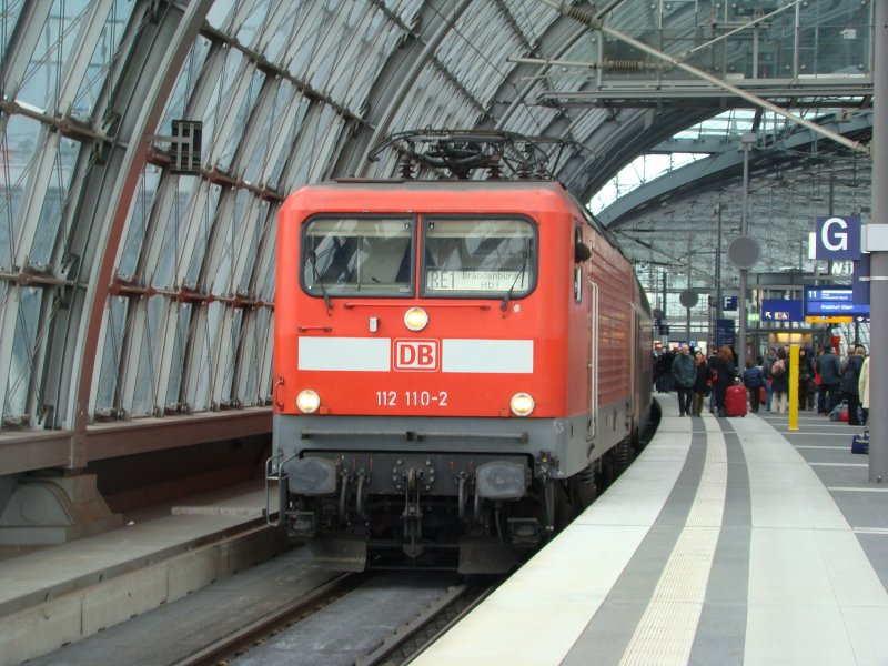BR 112 110-2 mit RE 38077 "RE1" nach Frankfurt/Oder. Heute am 29.12.2007 fährt dieser RE nur bis Fangschleuse. Grund: Bauarbeiten an der Strecke. Aufgenommen Berlin Hauptbahnhof. Marcel W.