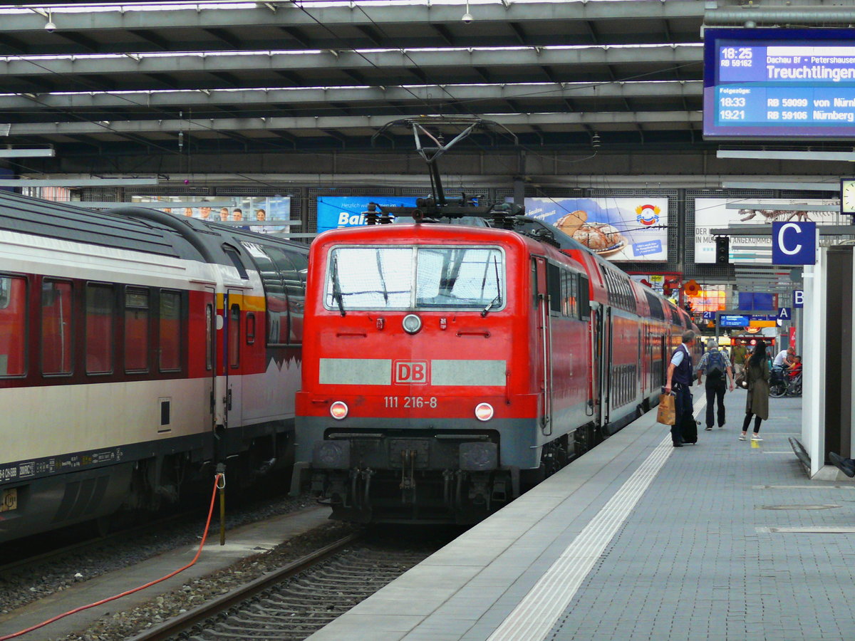 BR 111 216-8, Dostos und ein Wittenberger Kopf watren am 23.05.2018 am Münchner Hauptbahnhof und warten auf die Abfahrt nach Treuchtlingen. Der RB 59162 fährt aber diesesmal nicht ganz bis Nürnberg Hbf.