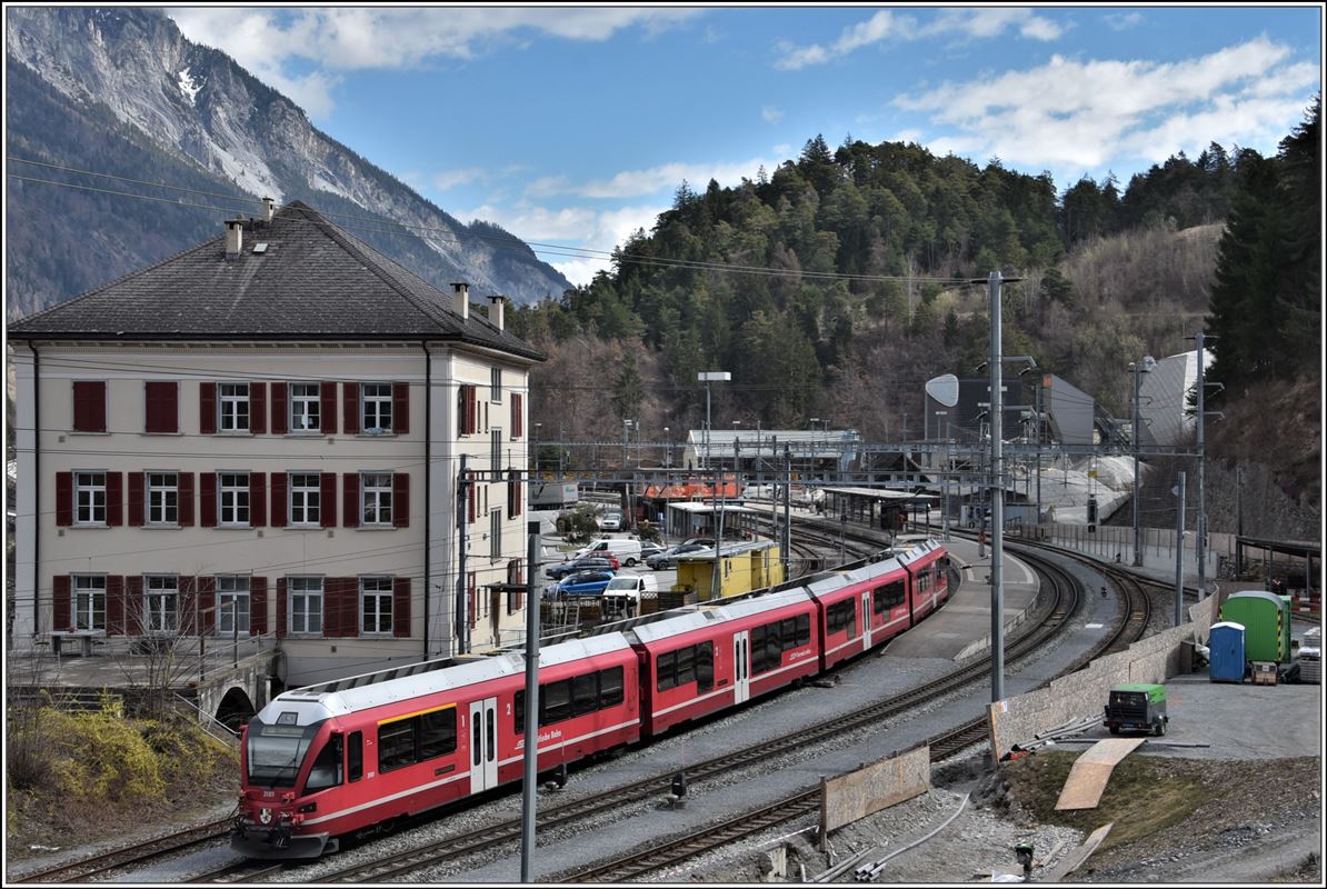 Ausfahrt aus der Station Alvaneu nach einem Kreuzungshalt auf der Rückfahrt. Julian Ryf