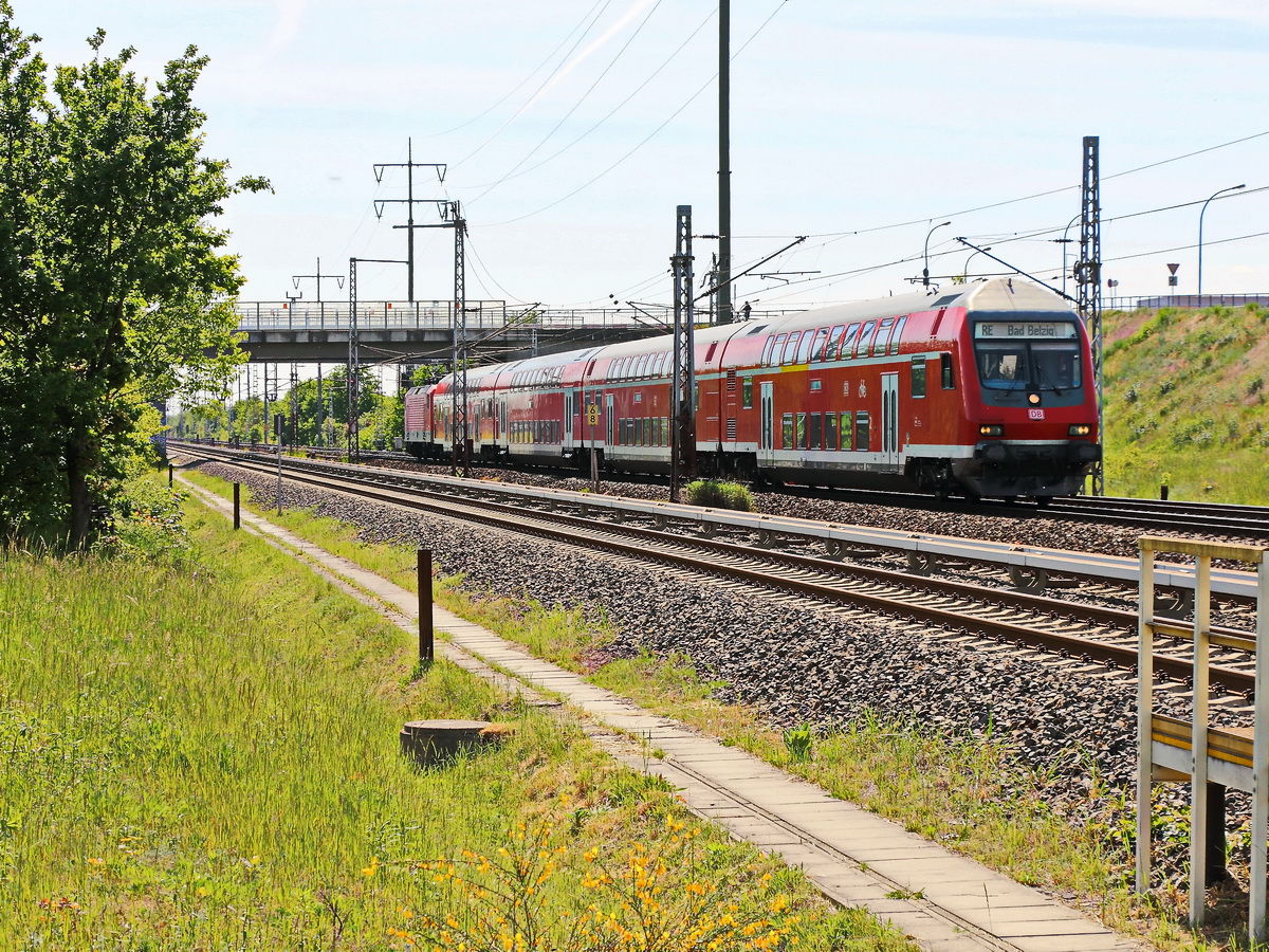 Einfahrt RE 7 nach Bad Belzig kurz vor dem Bahnhof Berlin Flughafen Schönefeld am 21. Mai 2020 mit Schublok 112 155-7 und Doppelstock Steuerwagen. Standort an der Waßmannsdorfer Chaussee (B 96) in einer Grünanlage.