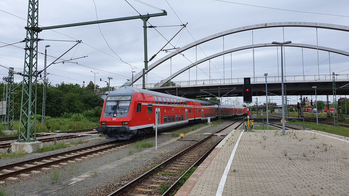 Gerade eingetroffen ist RE 7 (RE 3709) in Dessau Hbf, geschoben von 112 155.