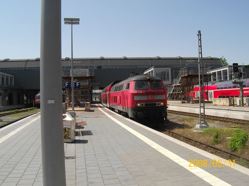 Ein 218er-Doppelpack, bestehend aus 218 158-4 und 218 260-8, am 29.06.2008 mit einem RE aus Kiel Hbf im frisch renovierten Lübecker Hauptbahnhof. Julian Düll