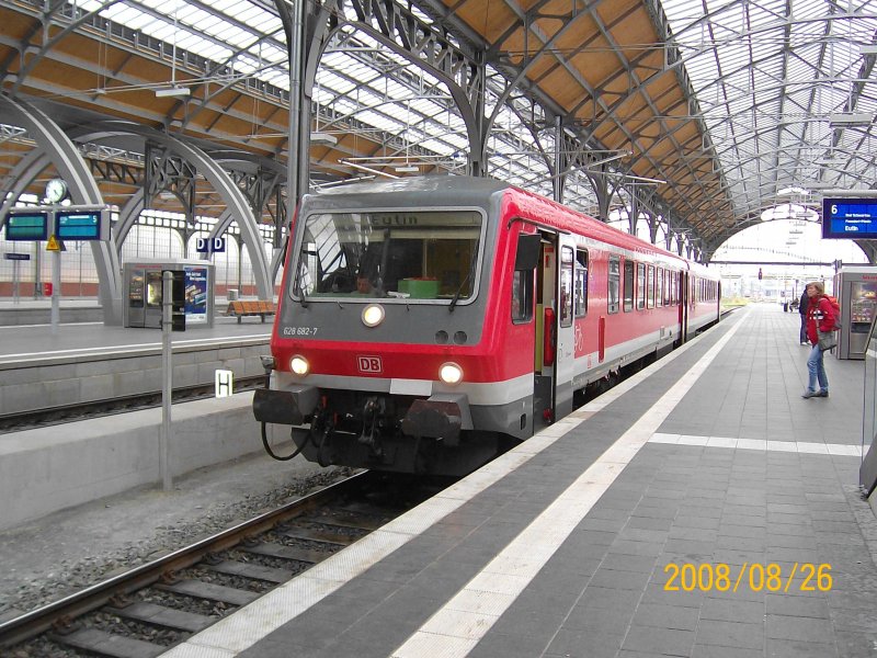 Links auf Gleis 6 steht 628 682-7 als RB 21674 nach Eutin und recht auf Gleis 7 fährt 218 435-6 mit RE 21426 aus Hamburg Hbf. Der Zug fährt als RE 21579 zurück nach Hamburg Hbf. 26.08.08. Lars Backhaus