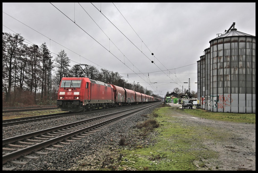 Captrain Lok 185539-3 mit Mannesmann Werbung kam am 11.1.2023 um 10.31 Uhr mit dem Kohlependel in Richtung Ruhrgebiet durch den Bahnhof Kattenvenne. Gerd Hahn