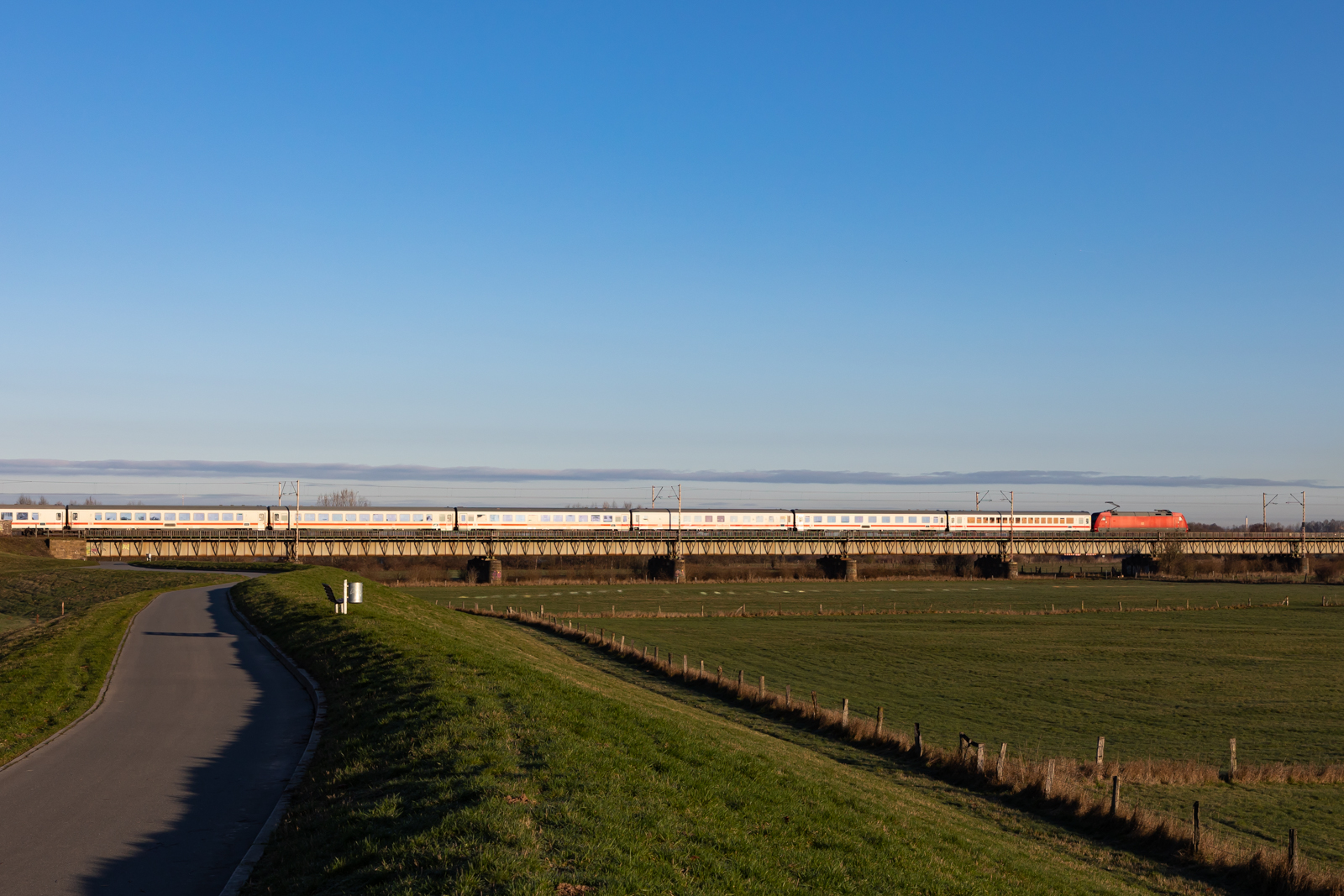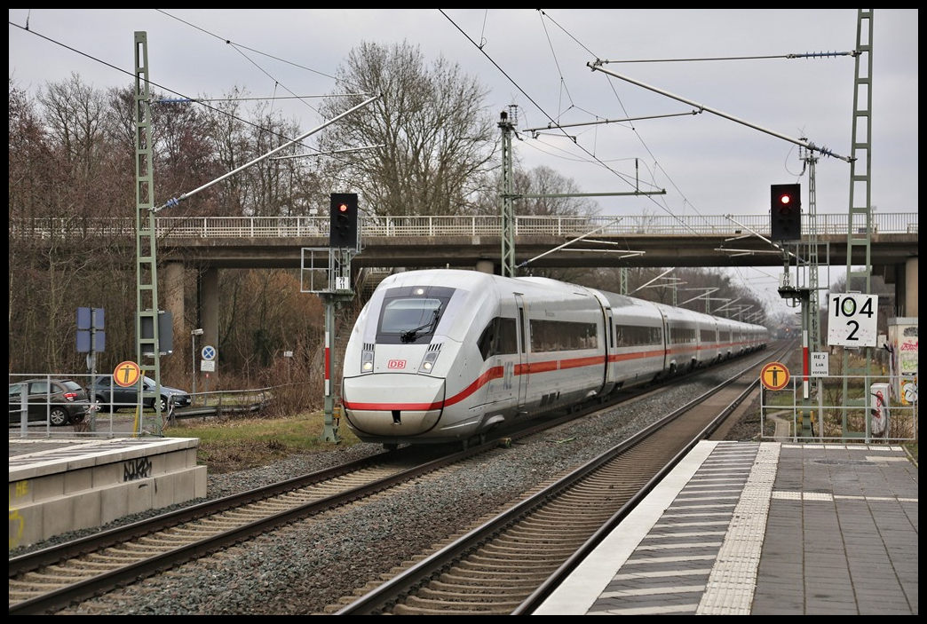 Ein ICE 4 erreicht hier am 13.02.2023 um 13.51 Uhr auf seiner Fahrt in Richtung Münster die Landesgrenze zwischen Niedersachsen und Nordrhein - Westfalen. Gerd Hahn