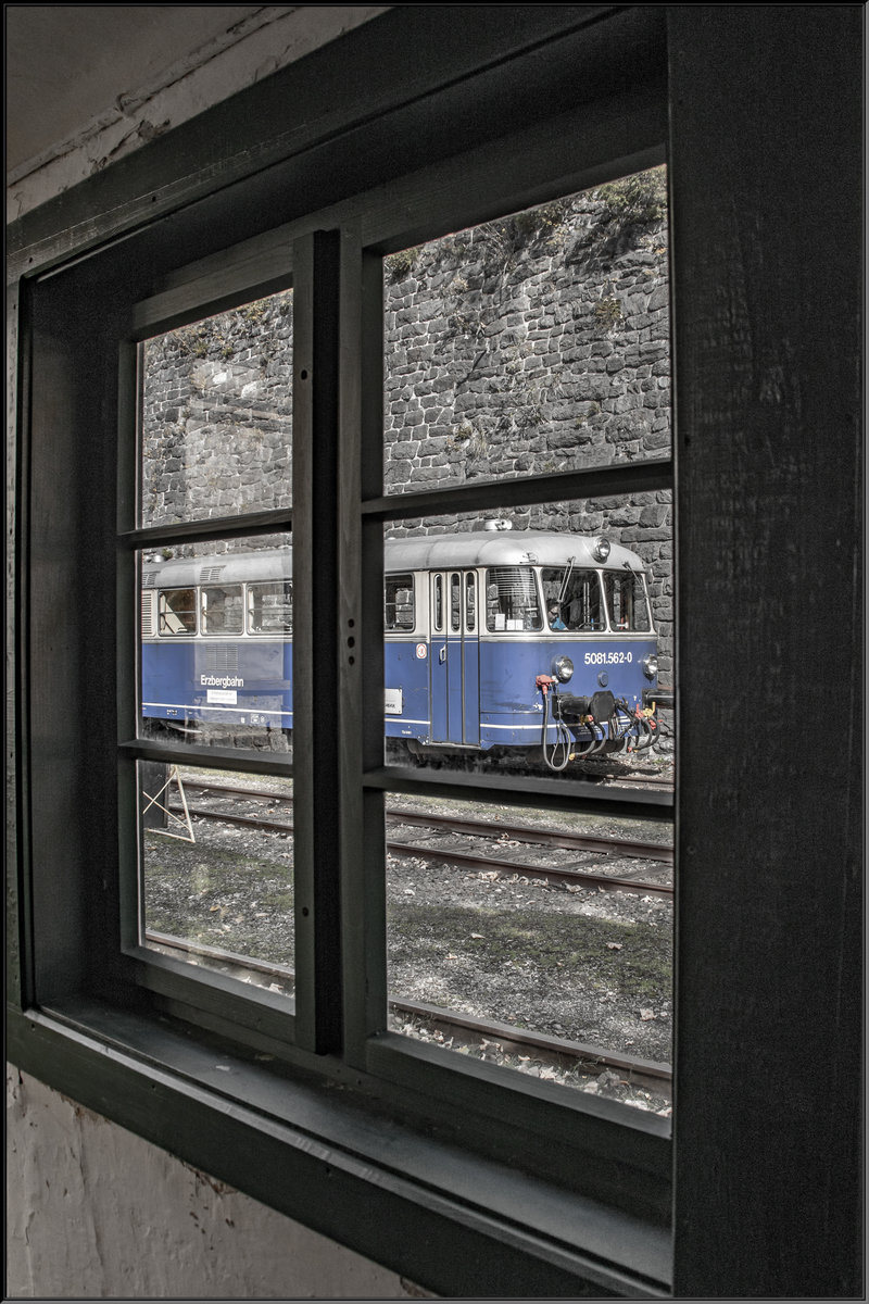 Im Bahnhof Erzberg wartet unser Fotosonderzug auf weiter Anweisungen des Stellwerkers der durch die Fenster seines Häuschens alles im Blick hat.